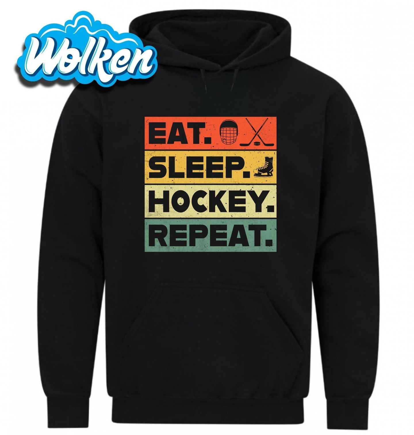 Pánská mikina Jez Spi Hokej Opakuj Eat Sleep Hockey Repeat. Tuhle rutinu zná každý hokejový srdcař – jídlo, spánek, led a zase dokola! Stylový retro design pro všechny, kteří žijí hokejem od rána do večera. Ať jsi hráč, brankář nebo fanoušek, tohle mluví za tebe.