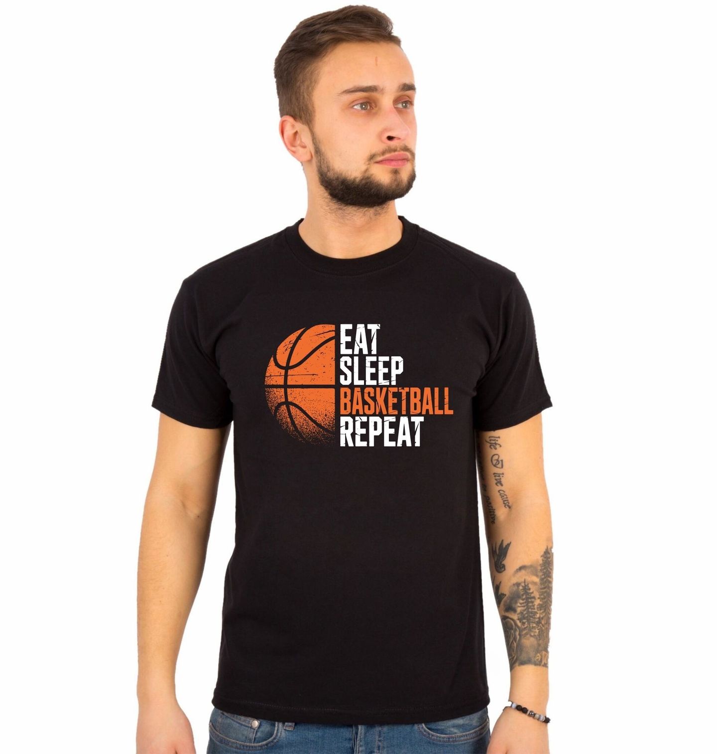 Pánské tričko Jez Spi Hraj Basketbal Opakuj Eat Sleep Basketball Repeat. Motiv pro každého, kdo žije basketbalem. Jednoduché motto „Eat. Sleep. Basketball. Repeat.“ vystihuje každodenní realitu hráčů i fanoušků. Stylová grafika s basketbalovým míčem a nápisem doplní každý outfit nebo doplněk milovníka sportu.
