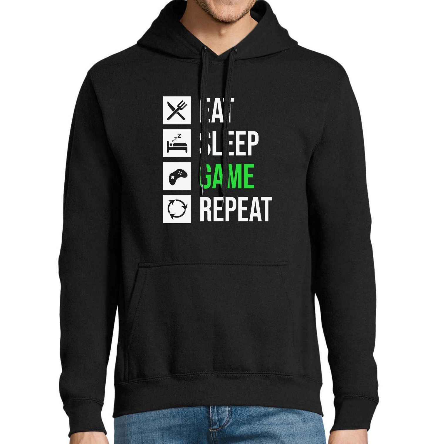 Pánská mikina Jez Spi Hraj Opakuj Eat Sleep Game Repeat. Minimalistický, ale výstižný design pro všechny vášnivé hráče! Ať už paříš na konzoli, PC nebo mobilu – tohle tričko shrnuje tvůj denní režim dokonale. Ideální pro gamery všech úrovní, od casual hráčů až po hardcore pařmeny.