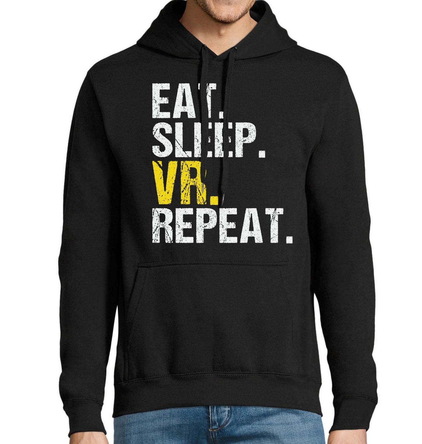 Pánská mikina Jez Spi VR Opakuj. „EAT. SLEEP. VR. REPEAT.“ - Jez. Spi. Virtuální realita. Opakuj. Tento motiv zachycuje jednoduché, ale výstižné motto moderní digitální kultury, kde hlavní roli hraje umělá inteligence, virtuální realita a technologie budoucnosti. Ideální pro všechny, kteří doma mají VR brýle a milují videohry, gaming a moderní technologie.