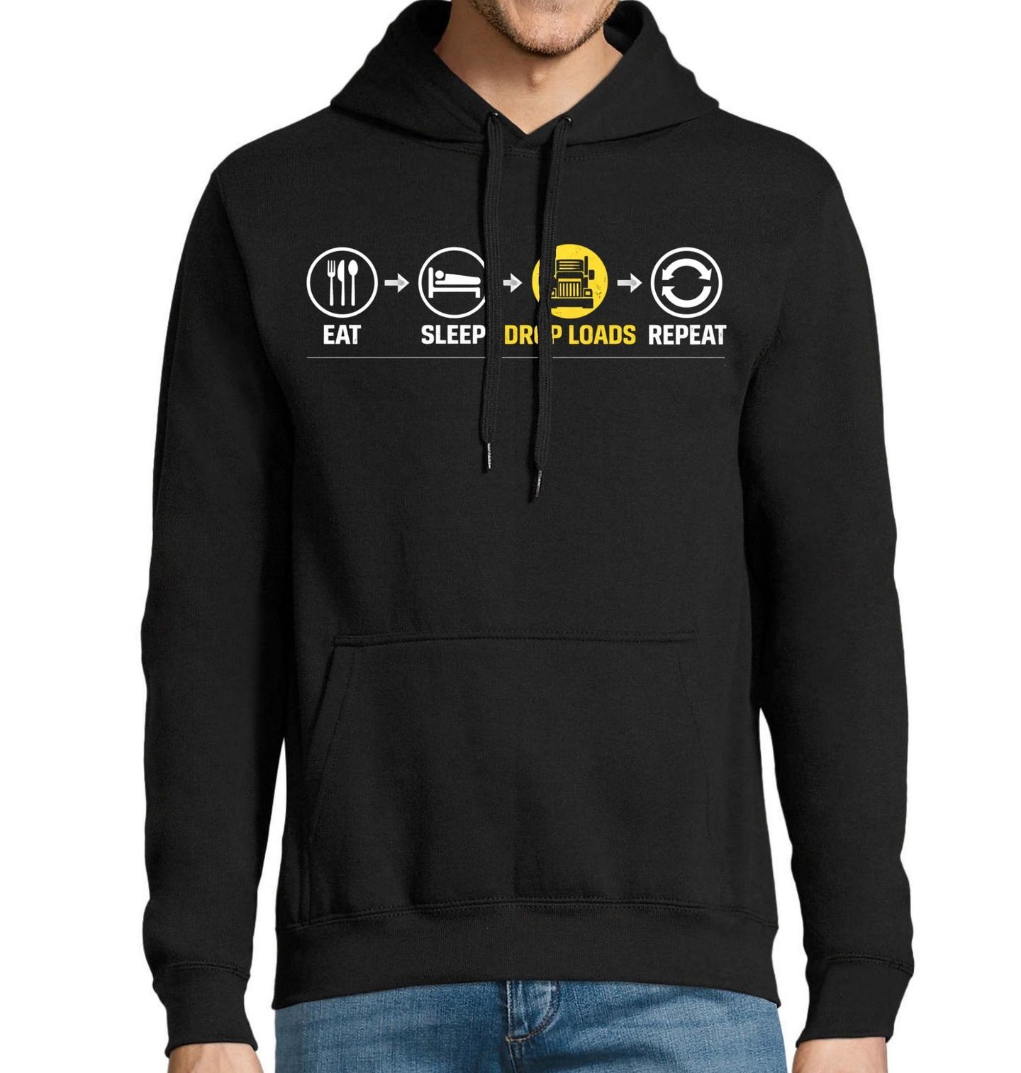 Pánská mikina Jez Spi Vykládej Náklad Opakuj Eat Sleep Drop Loads Repeat. Ikonický motiv s piktogramy jídla, spánku, kamionu a opakování. Text „Eat Sleep Drop Loads Repeat“ (Jez, spi, vykládej náklad, opakuj) vystihuje každodenní rutinu řidičů kamionů. Ideální dárek pro každého řidiče kamionu.