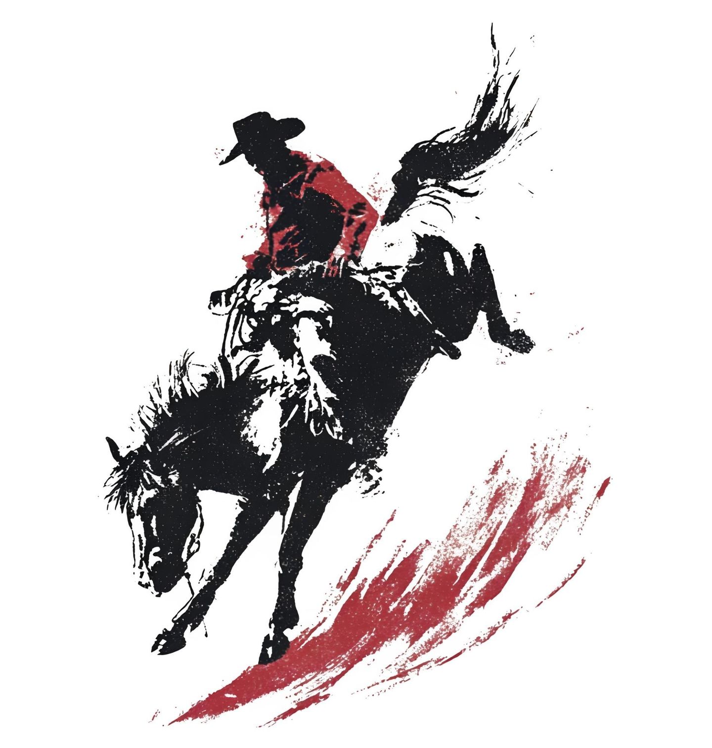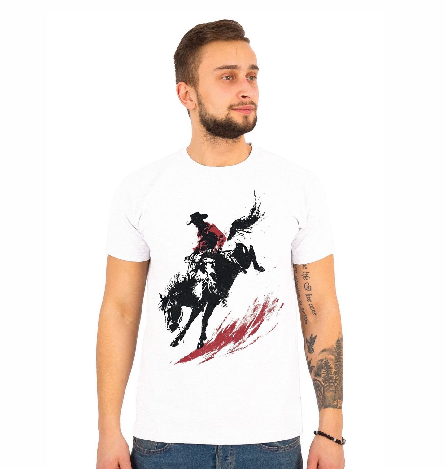 Pánské tričko Jezdec na Divokém Západě. Kůň v plné síle se vzpíná a vytváří napínavou scénu, ve které jezdec ukazuje odvahu, rovnováhu a zkušenost. Tento motiv zachycuje pravou atmosféru, jakou představuje divoký západ. Dynamika pohybu a kontrast barev dodávají obrazu energii a sílu.