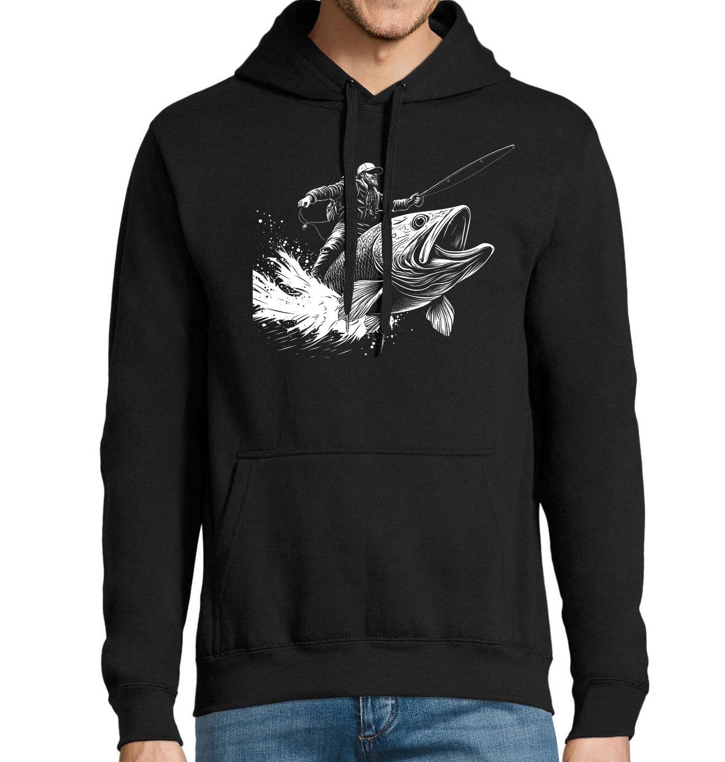 Pánská mikina Jezdec na rybě. Užijte si rybářskou fantazii naplno s tímto unikátním a vtipným motivem rybáře, který se řítí na obří rybě! Perfektní pro všechny, kdo tráví svůj čas u vody a chtějí vyjádřit svou vášeň s humorem. Ideální na trička, mikiny nebo jako nezapomenutelný dárek, který potěší každého rybáře!