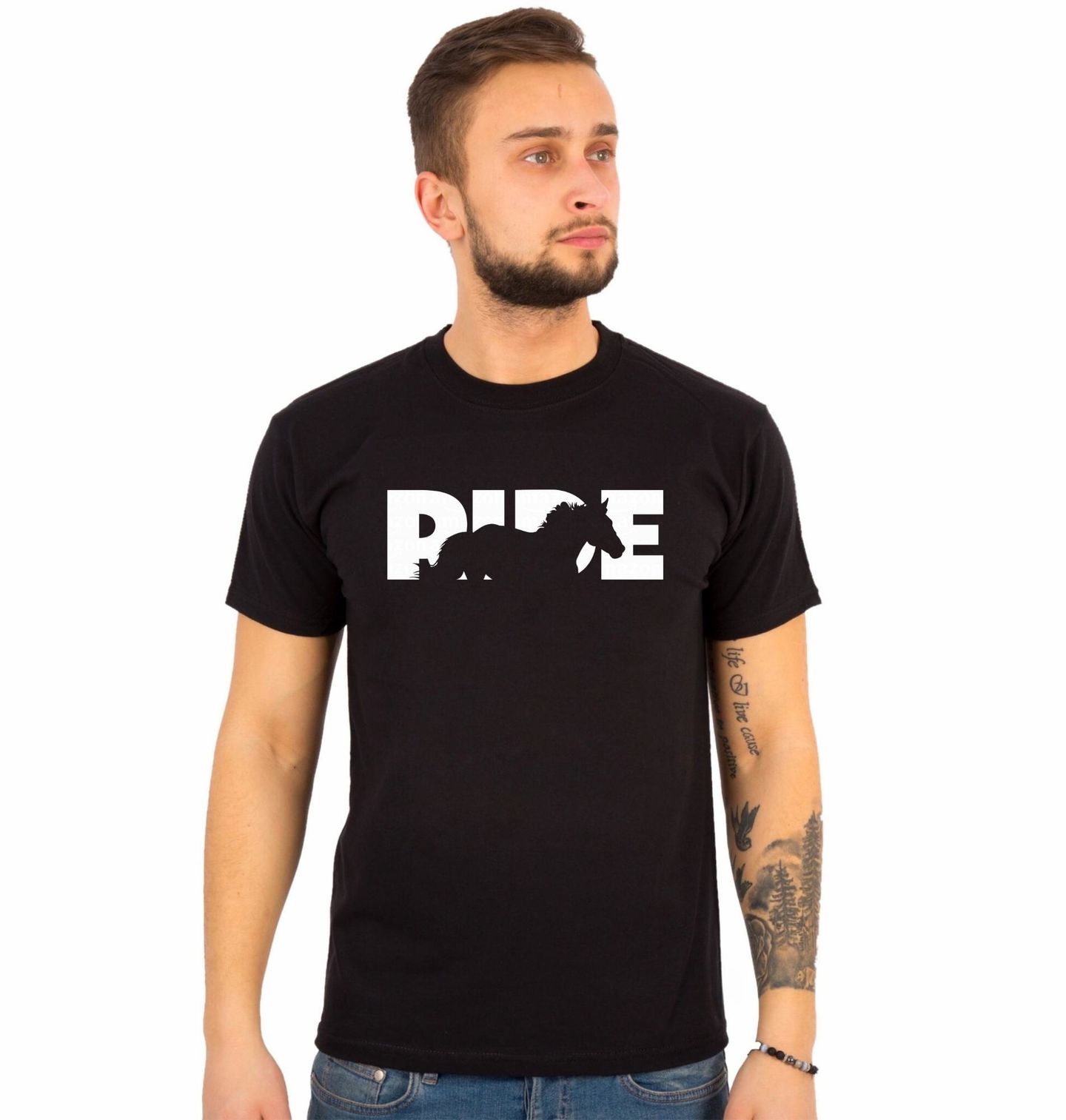 Pánské tričko Jezdi na Koni Ride. Originální motiv kůň vložený do slova „RIDE“ (v překladu „jezdit“) potěší všechny milovníky jízdy v sedle. Minimalistická silueta koně vypadá stylově, čistě a zároveň výrazně. Skvěle se hodí pro jezdce, jezdkyně, trenéry i ty, kteří prostě milují eleganci a svobodu, kterou kůň symbolizuje.