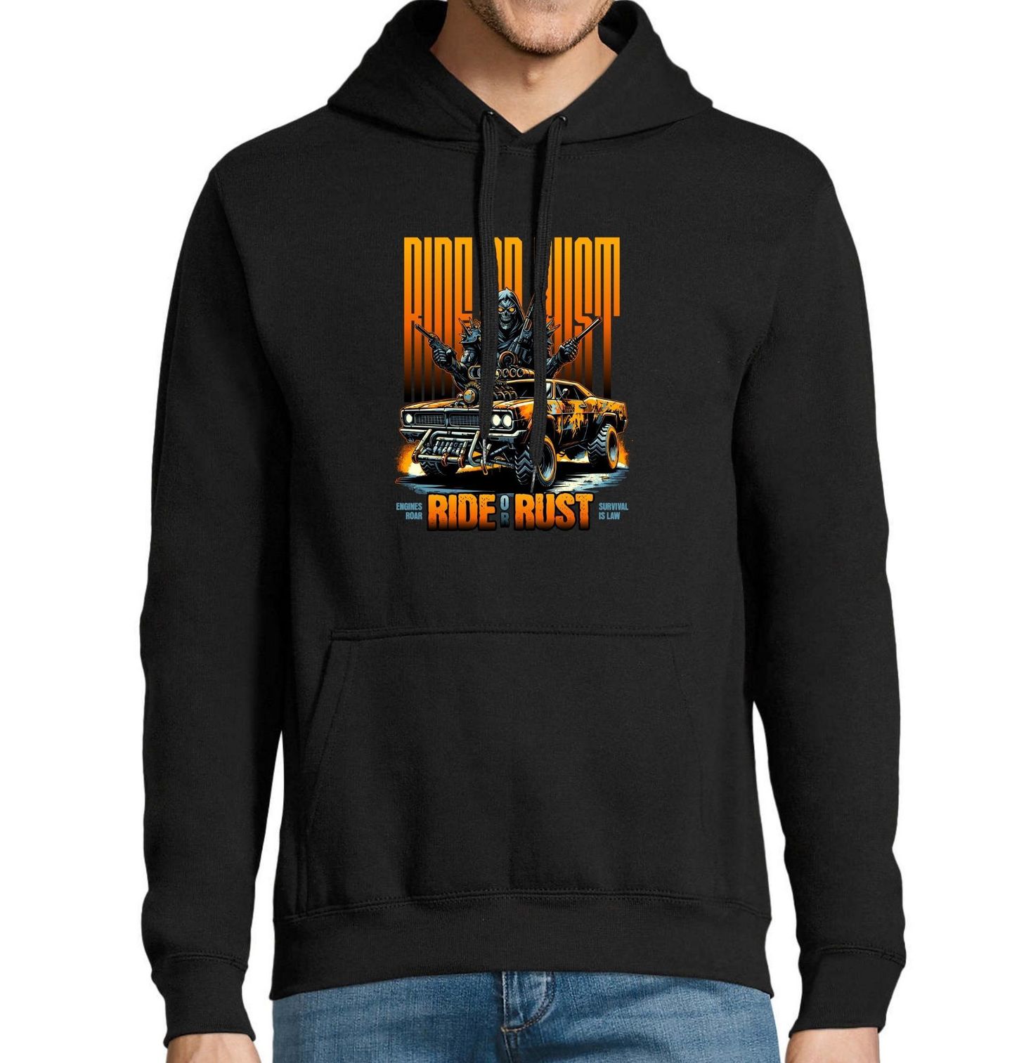 Pánská mikina Jezdi, nebo zrezni Ride or Rust. Auto v tomto designu není jen dopravní prostředek – je to zbraň, symbol síly, svobody a přežití v rozpadlém světě. Nápis „ride or rust“ (jeď, nebo zrezni) jasně vyjadřuje filozofii: buď jedeš naplno, nebo se rozpadneš. Dole: Engines roar = Motory řvou, Survival is law = Přežít je zákon