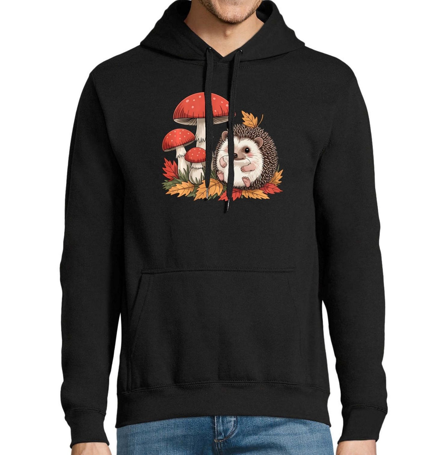 Pánská mikina Ježek a Muchomůrka v Podzimním Lese. Ilustrace zobrazuje usměvavého ježka sedícího mezi barevným podzimním listím a třemi červenými muchomůrkami, které rostou v prostředí podzimního lesa. Tento design v sobě spojuje hřejivou atmosféru podzimu, lesní pohodu a hravý vzhled, díky čemuž se tričko skvěle hodí pro každodenní nošení i jako originální dárek pro milovníky zvířat a lesa.