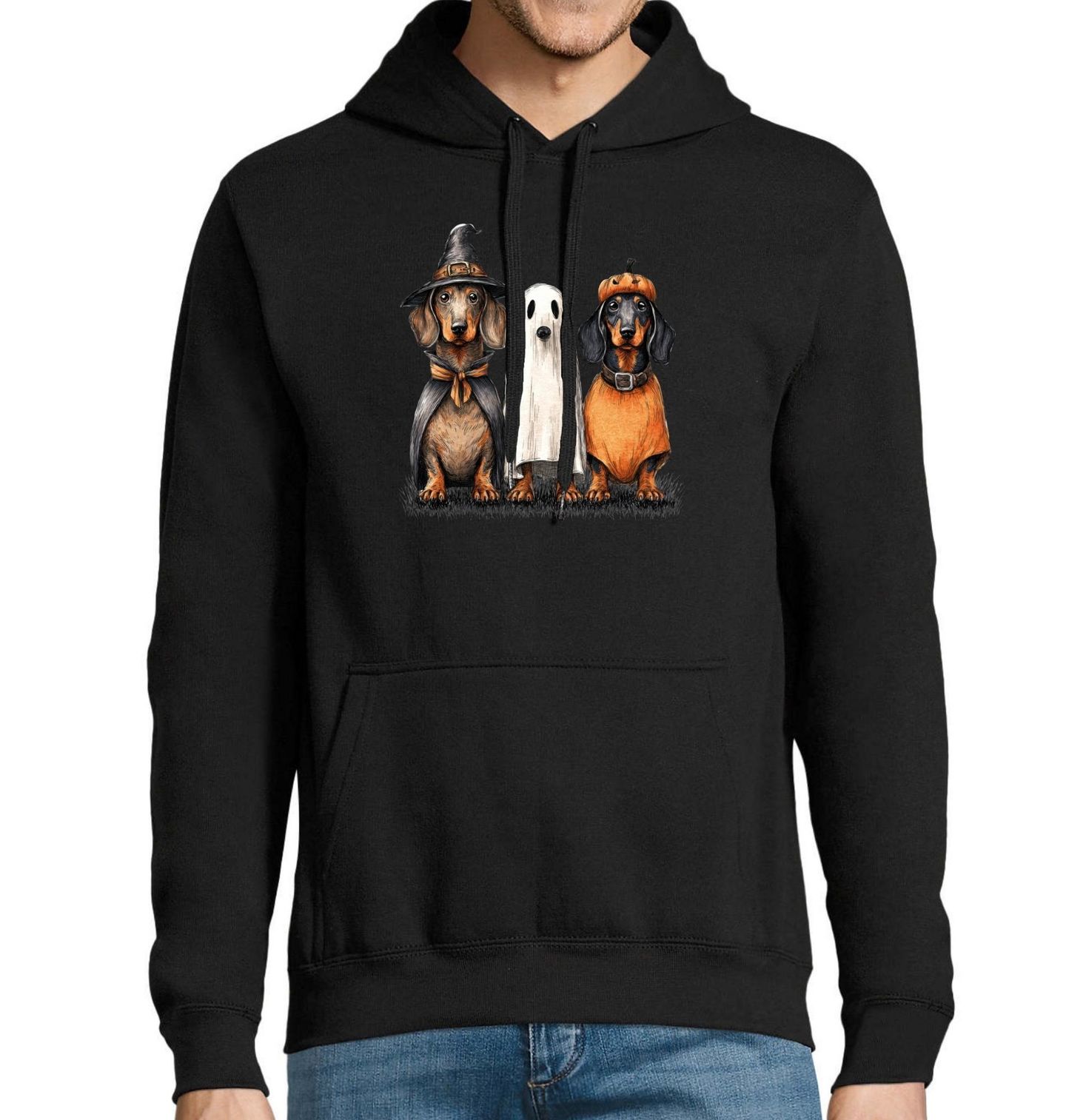 Pánská mikina Jezevčíci v přestrojení na Halloween. Veselé tričko s podzimním motivem pro každého milovníka Halloweenu! Tři kostýmovaní jezevčíci – čaroděj, duch a dýně – rozzáří každému pejskaři úsměv na tváři. Pokud je pes tvoje rodina, tenhle motiv prostě musíš mít. Skvělý kousek na podzimní procházky nebo jako originální dárek pro každého, kdo žije stylově – se psem po boku.