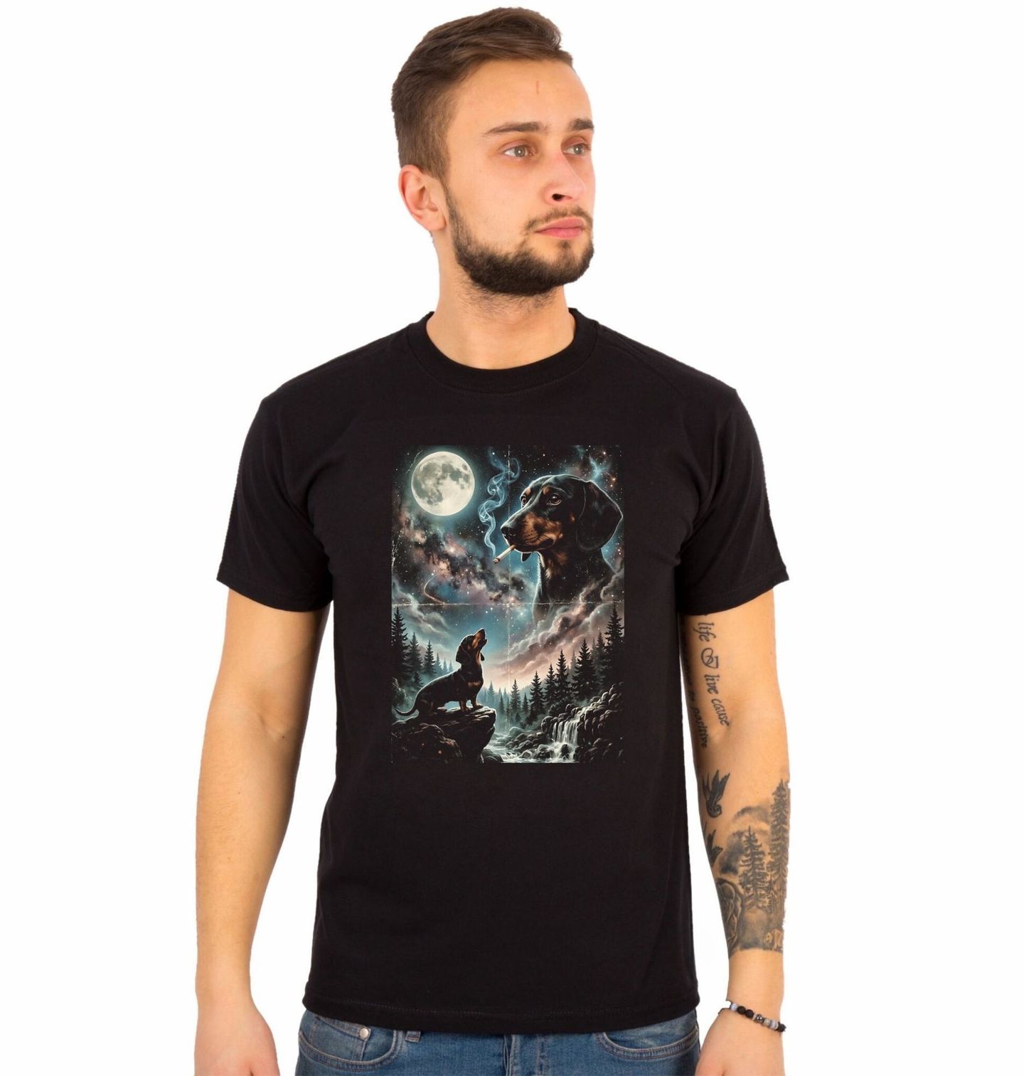 Pánské tričko Jezevčík a Kouzlo Úplňku. Mystická noční kompozice představuje psa plemene jezevčík sedícího na skále pod zářícím úplňkem. Hvězdná obloha, lesní krajina a jemná mlha vytvářejí tajemnou atmosféru, která dokonale vystihuje zvědavou a odvážnou povahu tohoto malého, ale energického psa.