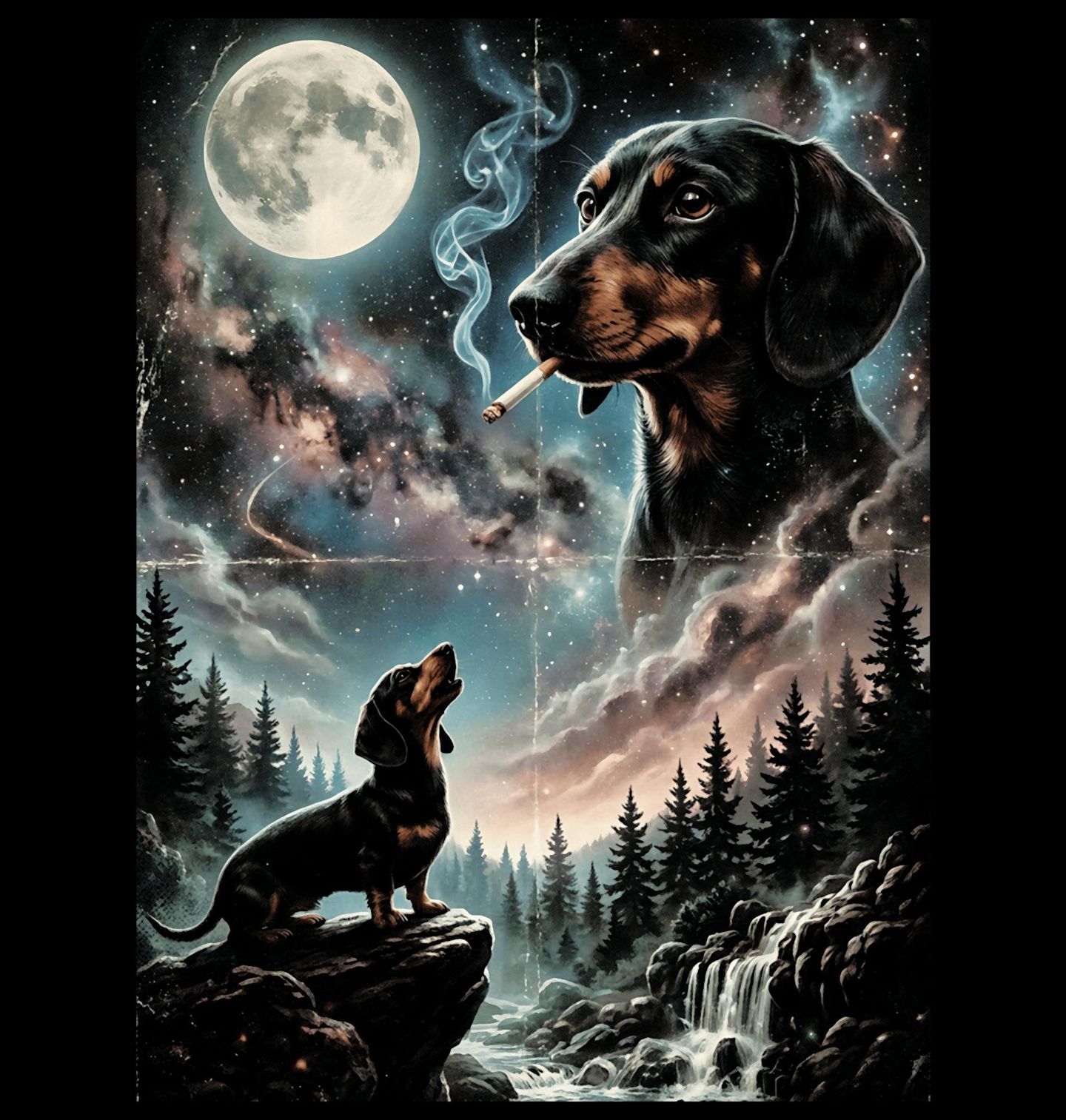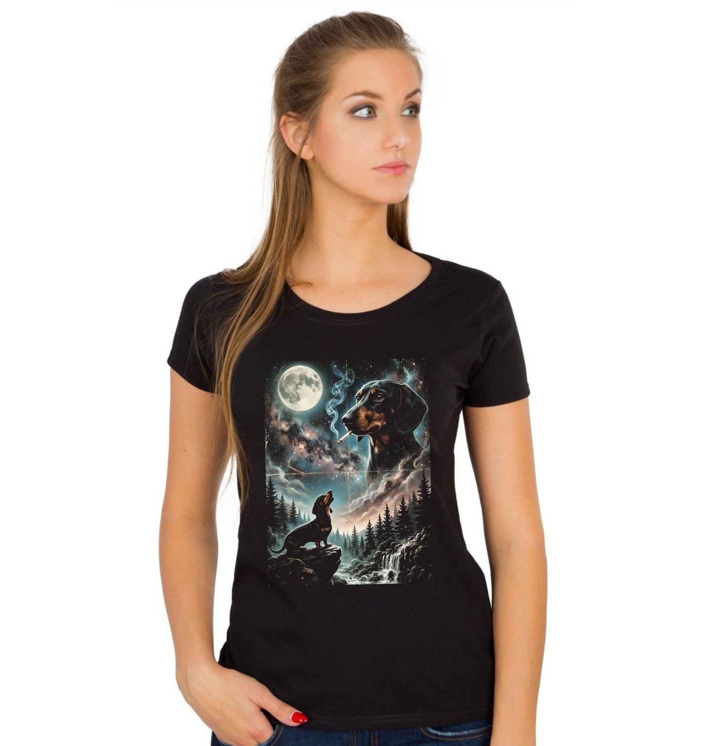Dámské tričko Jezevčík a Kouzlo Úplňku. Mystická noční kompozice představuje psa plemene jezevčík sedícího na skále pod zářícím úplňkem. Hvězdná obloha, lesní krajina a jemná mlha vytvářejí tajemnou atmosféru, která dokonale vystihuje zvědavou a odvážnou povahu tohoto malého, ale energického psa.