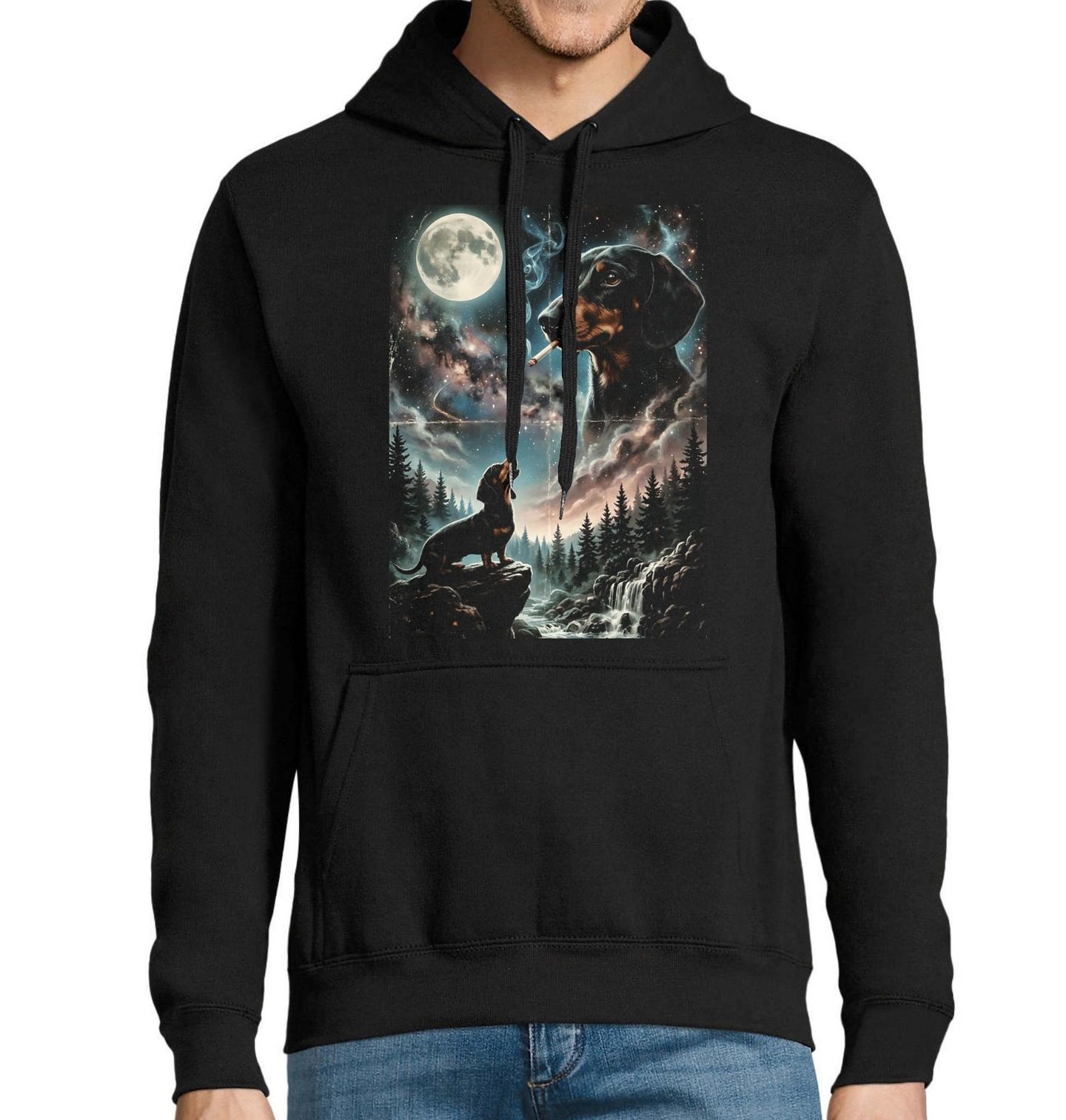 Pánská mikina Jezevčík a Kouzlo Úplňku. Mystická noční kompozice představuje psa plemene jezevčík sedícího na skále pod zářícím úplňkem. Hvězdná obloha, lesní krajina a jemná mlha vytvářejí tajemnou atmosféru, která dokonale vystihuje zvědavou a odvážnou povahu tohoto malého, ale energického psa.