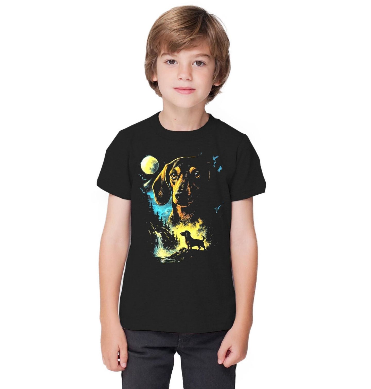 Dětské tričko Jezevčík a Měsíc. Tento stylizovaný motiv zachycuje jezevčíka v mystické noční krajině zalité světlem úplňku. Silueta malého psa stojícího na skále působí odvážně a odhodlaně, zatímco velká tvář v pozadí dodává obrazu snovou atmosféru. Design pes je ideální pro milovníky tohoto plemene i tajemných nočních scén.