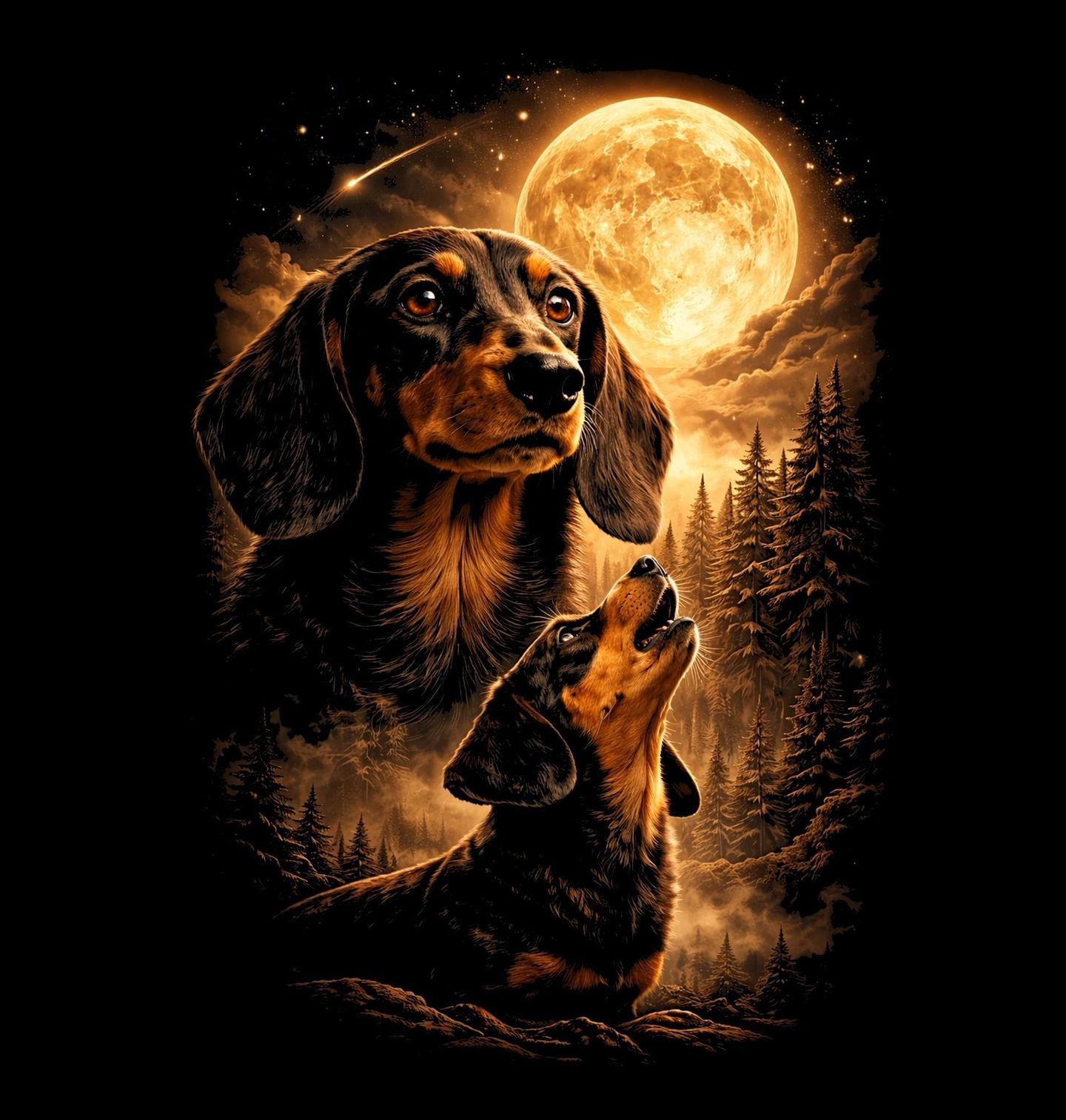 Pánské tričko Jezevčík při Úplňku. Atmosférická ilustrace jezevčíka obsahuje dramatickou scénu s kde tento krásný pes vyje na měsíc. Kombinuje přírodu, noční oblohu a silný vizuál, který osloví všechny pejskaře.