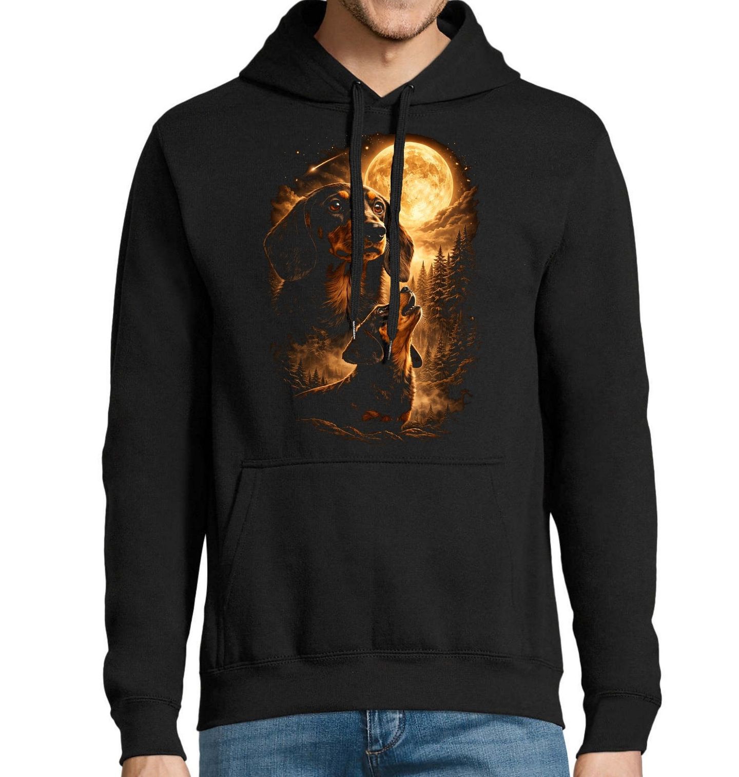 Pánská mikina Jezevčík při Úplňku. Atmosférická ilustrace jezevčíka obsahuje dramatickou scénu s kde tento krásný pes vyje na měsíc. Kombinuje přírodu, noční oblohu a silný vizuál, který osloví všechny pejskaře.