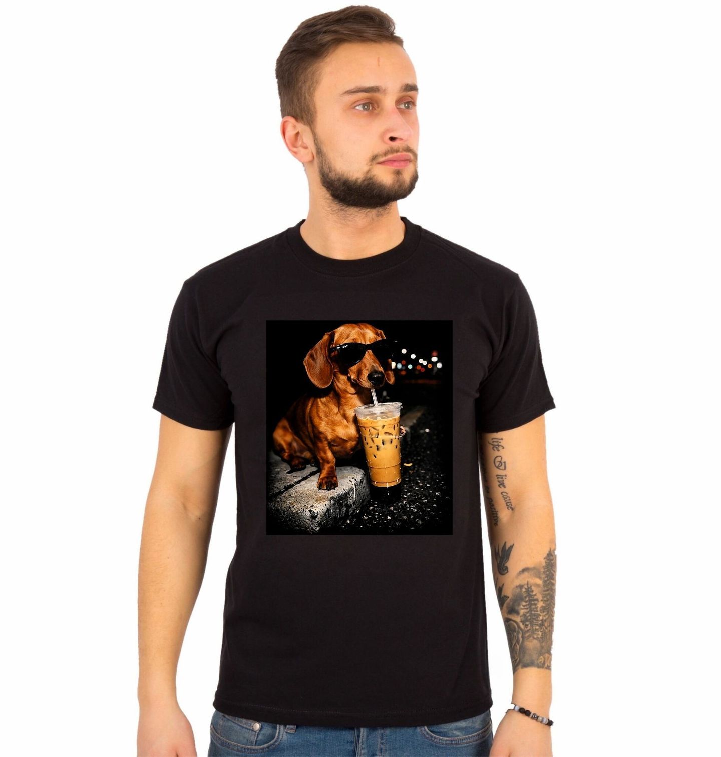 Pánské tričko Jezevčík s Drinkem. Moderní a hravý motiv zobrazuje psa plemene jezevčík, který si v nočním městě vychutnává populární nápoj bubble tea (také nazývaný boba). Stylový jezevčík se slunečními brýlemi působí sebevědomě a cool, zatímco světla města vytvářejí dynamickou atmosféru