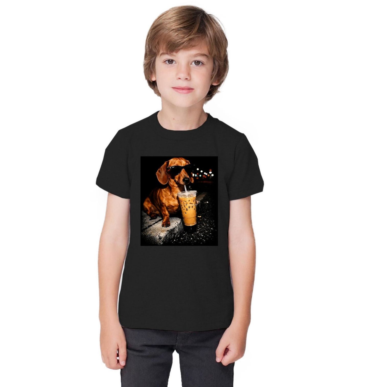 Dětské tričko Jezevčík s Drinkem. Moderní a hravý motiv zobrazuje psa plemene jezevčík, který si v nočním městě vychutnává populární nápoj bubble tea (také nazývaný boba). Stylový jezevčík se slunečními brýlemi působí sebevědomě a cool, zatímco světla města vytvářejí dynamickou atmosféru