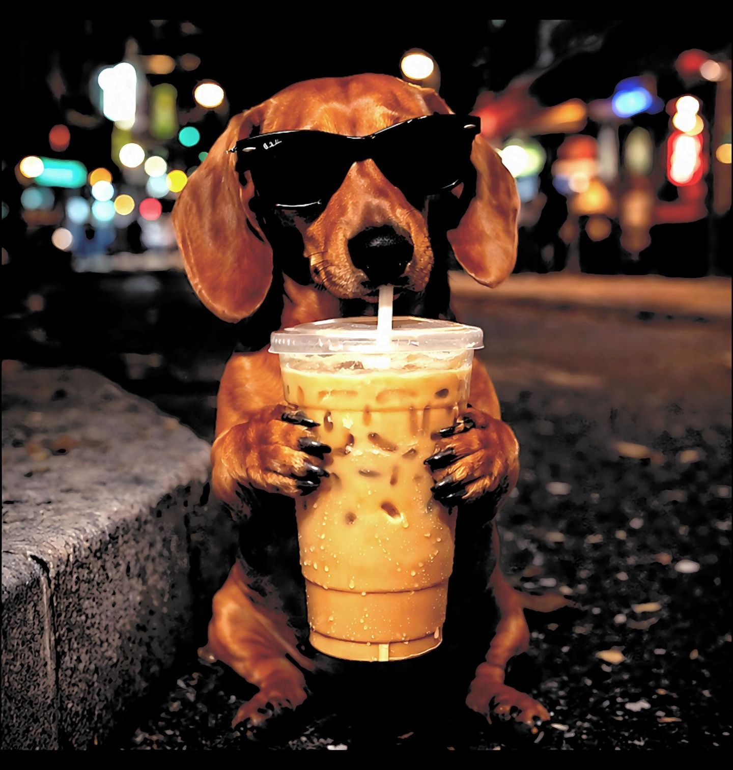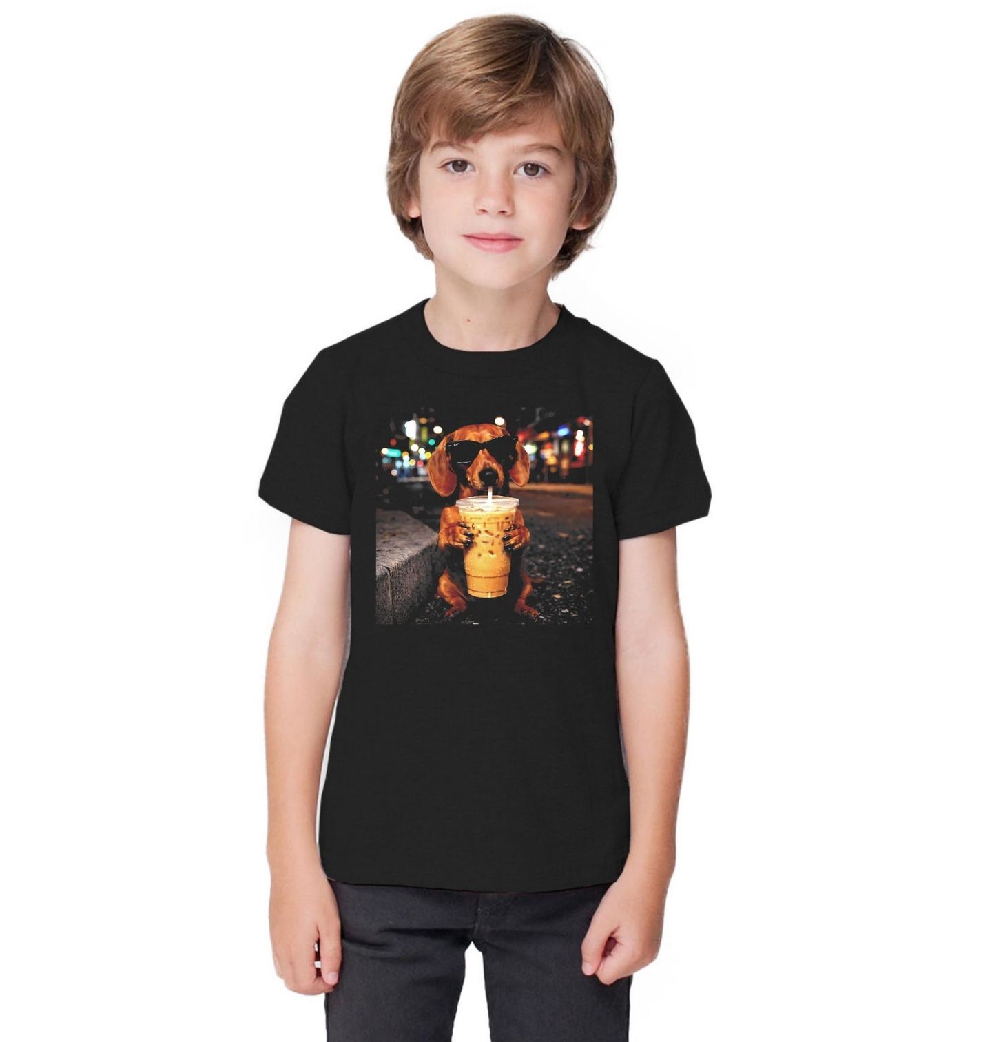 Dětské tričko Jezevčík s Ledovou Kávou. Humorný a originální motiv zachycuje psa plemene jezevčík v brýlích, jak si vychutnává velký kelímek ledové kávy ve večerním městě. Světla v pozadí vytvářejí moderní městskou atmosféru a dodávají designu styl i nadsázku. Tento pes motiv potěší milovníky jezevčíků i fanoušky vtipných ilustrací.