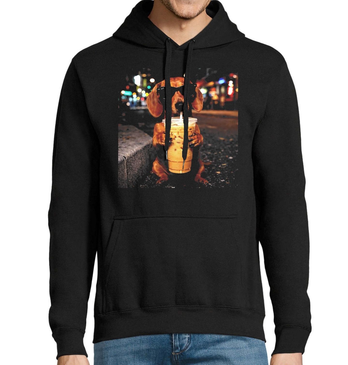 Pánská mikina Jezevčík s Ledovou Kávou. Humorný a originální motiv zachycuje psa plemene jezevčík v brýlích, jak si vychutnává velký kelímek ledové kávy ve večerním městě. Světla v pozadí vytvářejí moderní městskou atmosféru a dodávají designu styl i nadsázku. Tento pes motiv potěší milovníky jezevčíků i fanoušky vtipných ilustrací.