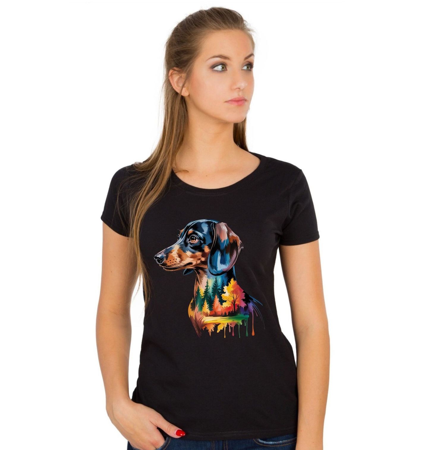 Dámské tričko Jezevčík v Barvách Lesa. Tenhle pes není jen roztomilý mazlíček, ale malý filozof. Stylový portrét jezevčíka, ve kterém se prolíná silueta psa s barevným motivem les, působí klidně, hluboce a trochu magicky. Ideální kousek pro každého pejskaře, který ví, že pes má vlastní svět, myšlenky a ticho, ve kterém je dobře.