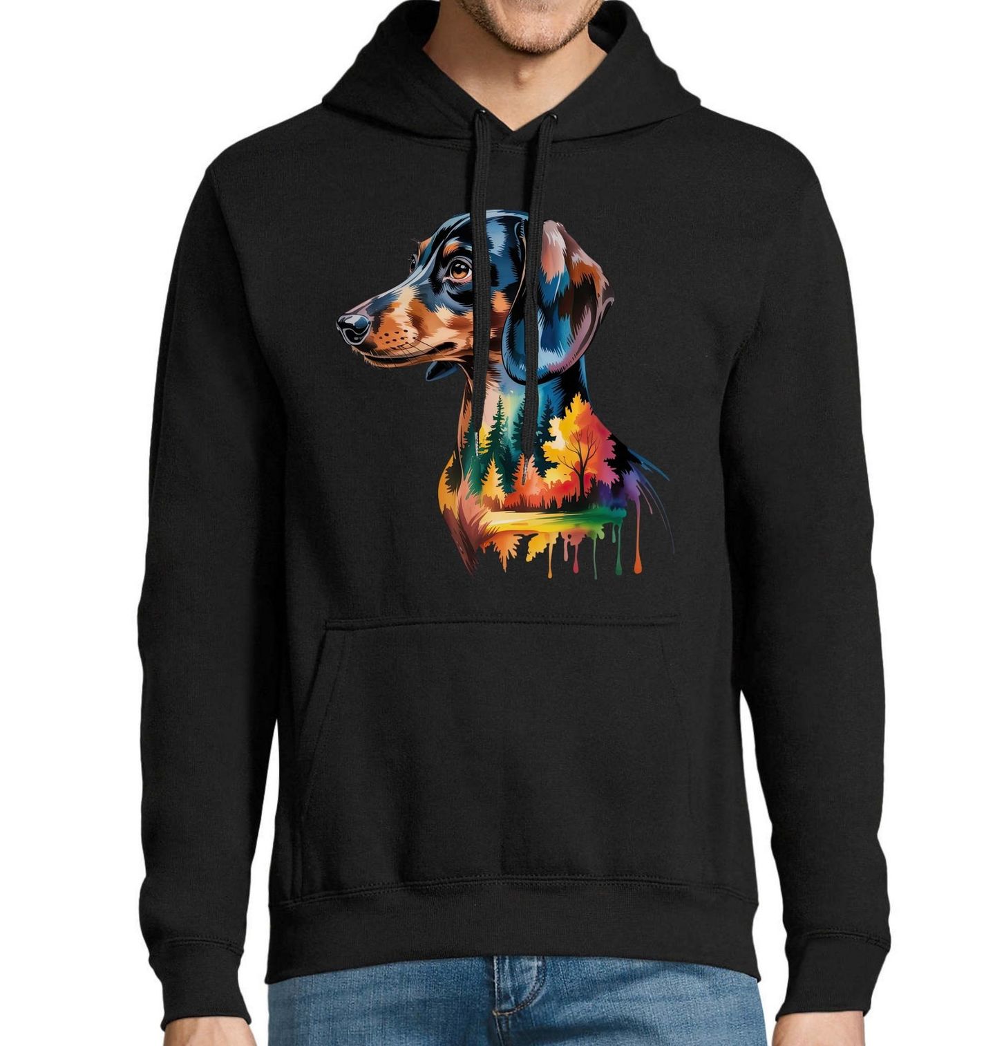 Pánská mikina Jezevčík v Barvách Lesa. Tenhle pes není jen roztomilý mazlíček, ale malý filozof. Stylový portrét jezevčíka, ve kterém se prolíná silueta psa s barevným motivem les, působí klidně, hluboce a trochu magicky. Ideální kousek pro každého pejskaře, který ví, že pes má vlastní svět, myšlenky a ticho, ve kterém je dobře.