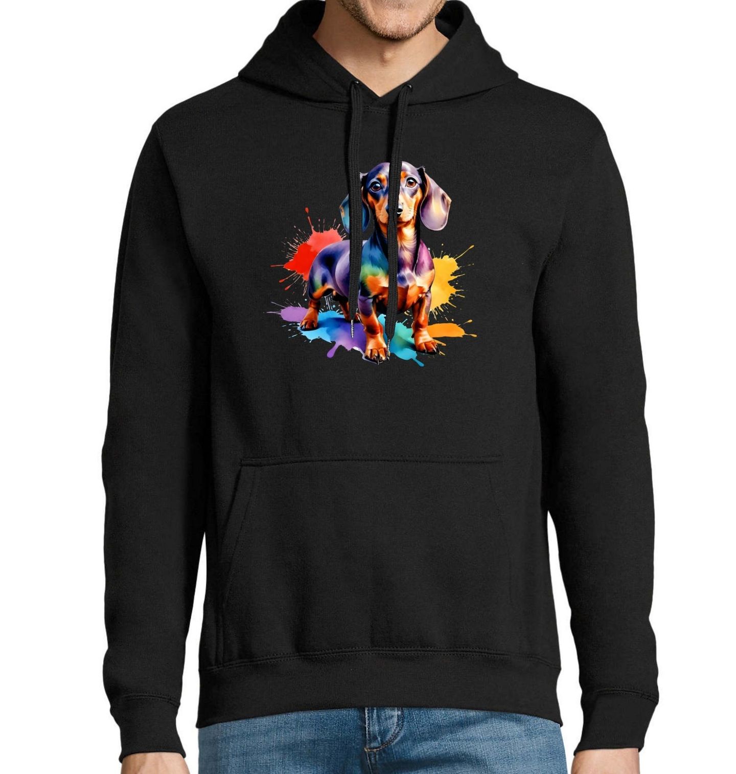 Pánská mikina Jezevčík v Explozi Barev. Tričko s originálním motivem, na kterém září jezevčík jako živé umělecké dílo. Každý pes si zaslouží trochu barev – a každý pejskař si zaslouží stylový kousek, který vyjádří jeho lásku ke čtyřnohým parťákům. Ideální volba pro milovníky psů, umění i výjimečných outfitů. Buď jiný, buď barevný – stejně jako tenhle psí mazlík!