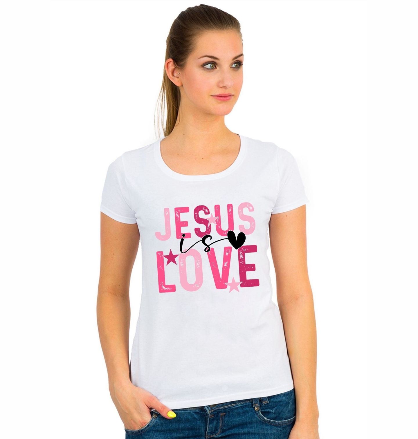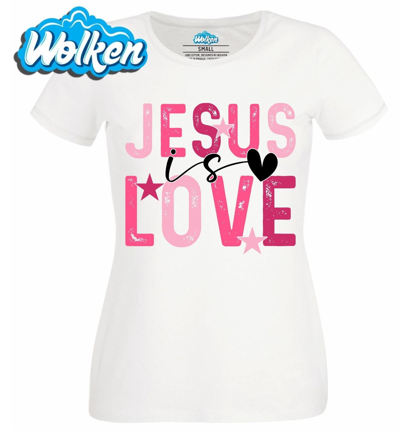 Dámské tričko Ježíš je Láska. Barevný a pozitivní motiv Ježíš je láska přináší poselství víry, naděje a radosti. Ideální pro všechny, kdo chtějí vyjádřit svou víru stylově a s úsměvem. Růžové a červené tóny doplněné srdcem a hvězdami vytvářejí jemný design s hlubokým poselstvím.