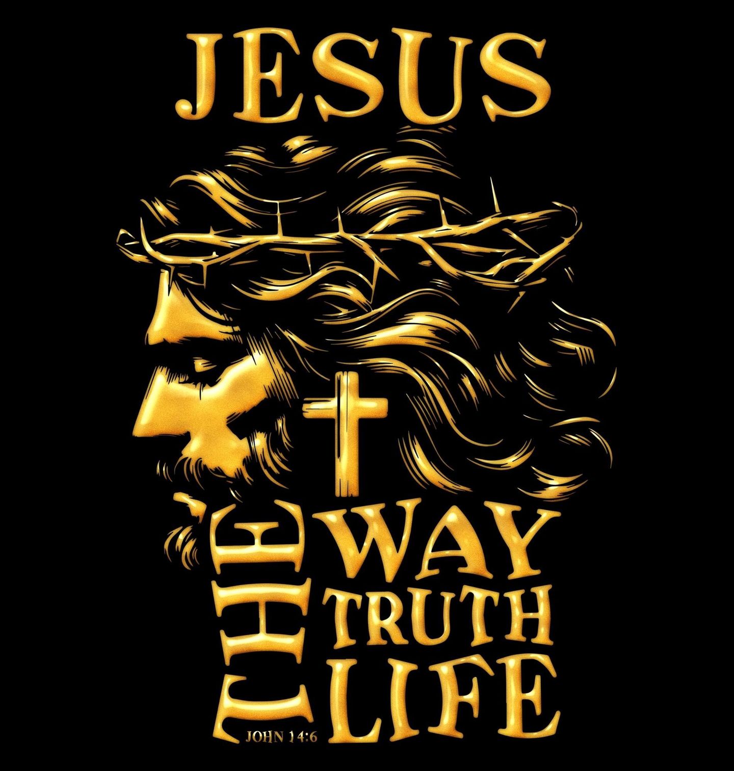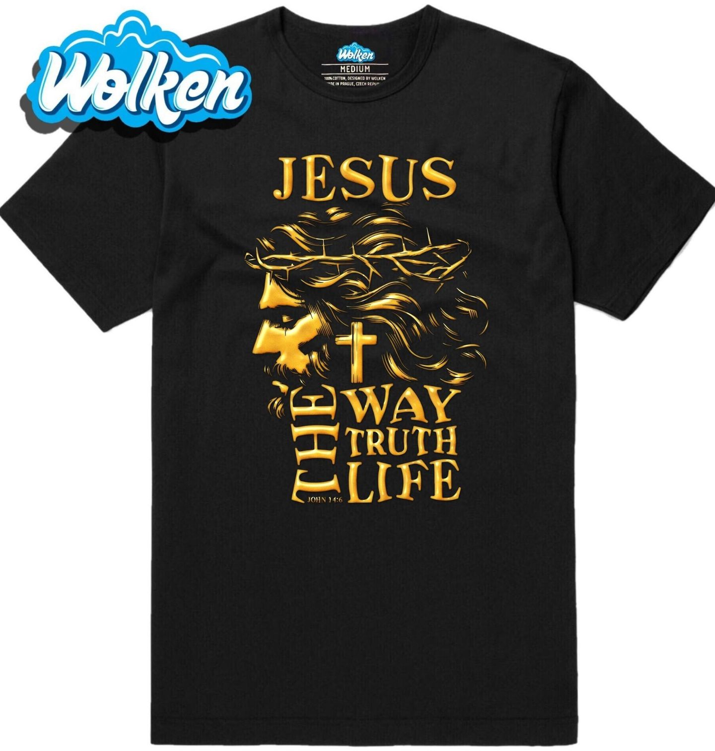 Pánské tričko Jěžíš Kristus Cesta Pravda Život. Tento motiv s Ježíšem Kristem je inspirován biblickým veršem Jan 14:6: JESUS – THE WAY, THE TRUTH, THE LIFE. Ikonická silueta Ježíše s trnovou korunou, křížem a silným poselstvím symbolizuje podstatu křesťanství, víry a naděje. Ideální dárek pro každého, kdo vyznává náboženství, věří v Ježíše a chce šířit lásku, pravdu a světlo.