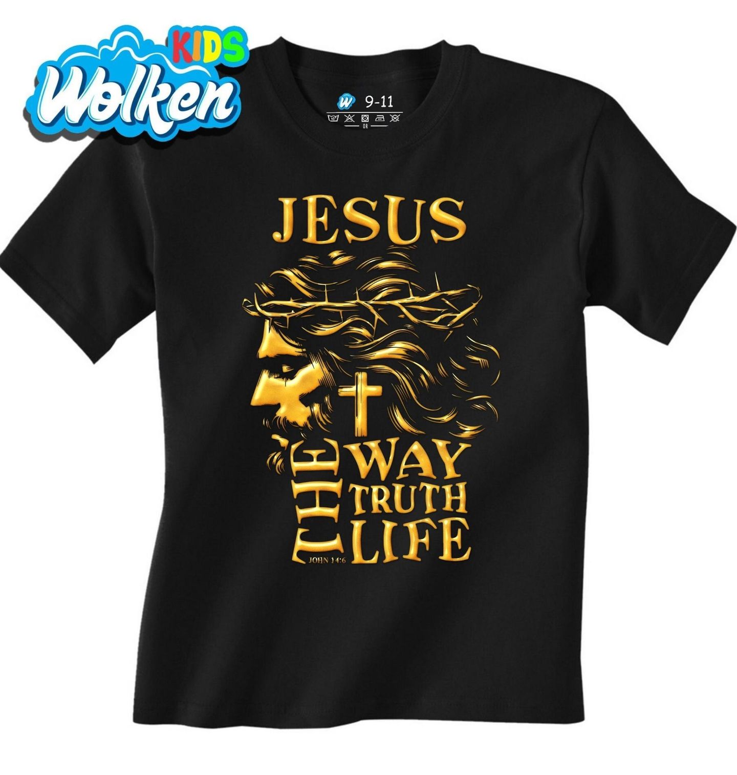 Dětské tričko Jěžíš Kristus Cesta Pravda Život. Tento motiv s Ježíšem Kristem je inspirován biblickým veršem Jan 14:6: JESUS – THE WAY, THE TRUTH, THE LIFE. Ikonická silueta Ježíše s trnovou korunou, křížem a silným poselstvím symbolizuje podstatu křesťanství, víry a naděje. Ideální dárek pro každého, kdo vyznává náboženství, věří v Ježíše a chce šířit lásku, pravdu a světlo.