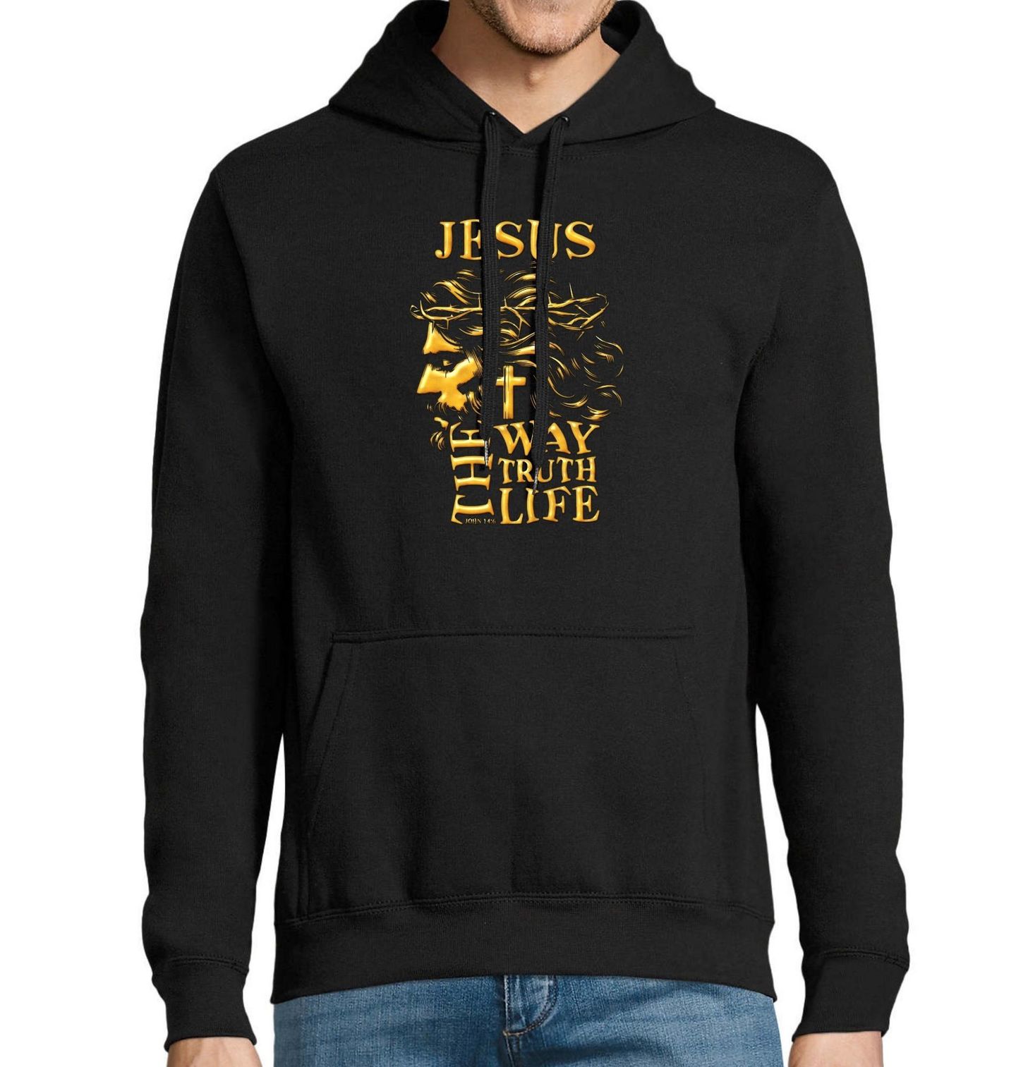 Pánská mikina Jěžíš Kristus Cesta Pravda Život. Tento motiv s Ježíšem Kristem je inspirován biblickým veršem Jan 14:6: JESUS – THE WAY, THE TRUTH, THE LIFE. Ikonická silueta Ježíše s trnovou korunou, křížem a silným poselstvím symbolizuje podstatu křesťanství, víry a naděje. Ideální dárek pro každého, kdo vyznává náboženství, věří v Ježíše a chce šířit lásku, pravdu a světlo.