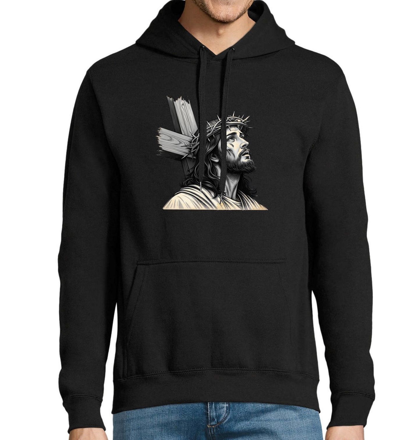 Pánská mikina Ježíš Kristus Ježíšova oběť. Ježíš Kristus s trnovou korunou a křížem je hlubokým symbolem víry, odpuštění a oběti. Tento design je silným vyjádřením křesťanské víry a osobní oddanosti. Vhodné pro každého, kdo ctí náboženství a chce svým oblečením připomenout sílu Ježíšovy oběti za lidstvo.