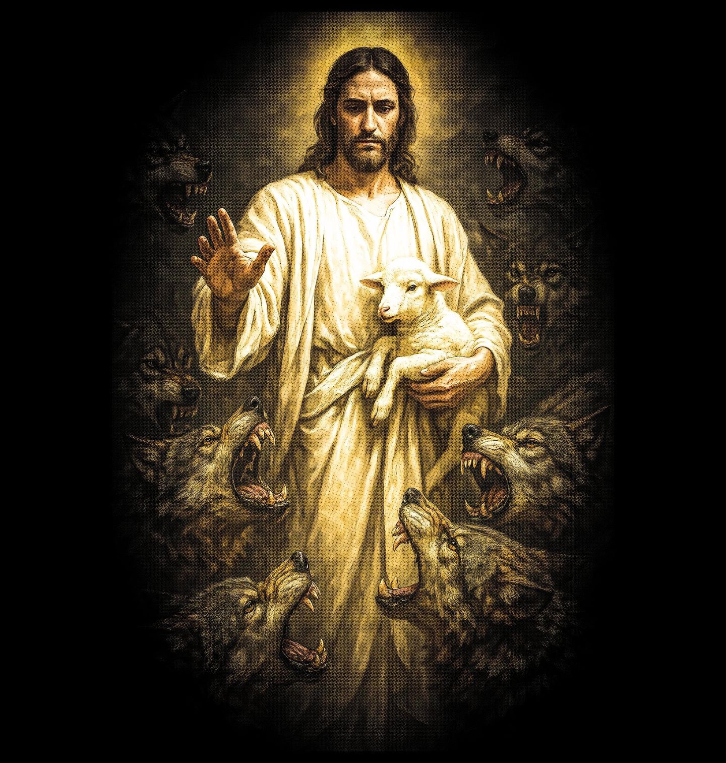 Dámské tričko Ježíš Kristus Ochránce Slabých. Motiv vychází z biblického obrazu „beránek mezi vlky“, kde beránek symbolizuje nevinnost, čistotu a oběť, zatímco vlci představují násilí, pokušení a temné síly světa. Tento silný motiv vychází z hluboké tradice křesťanství a zobrazuje Ježíše jako dobrého pastýře, který chrání beránka před vlky.