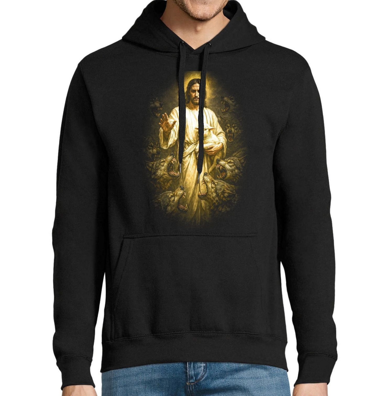 Pánská mikina Ježíš Kristus Ochránce Slabých. Motiv vychází z biblického obrazu „beránek mezi vlky“, kde beránek symbolizuje nevinnost, čistotu a oběť, zatímco vlci představují násilí, pokušení a temné síly světa. Tento silný motiv vychází z hluboké tradice křesťanství a zobrazuje Ježíše jako dobrého pastýře, který chrání beránka před vlky.