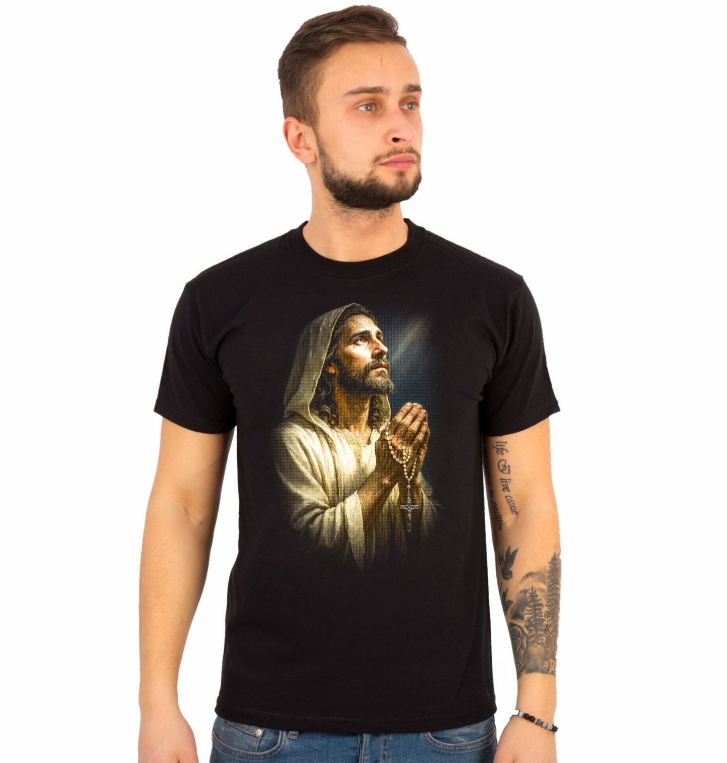 Pánské tričko Ježíš Kristus při Modlitbě. Motiv vychází z tradiční ikonografie křesťanství, kde je Ježíš zobrazován nejen jako Spasitel světa, ale také jako ten, kdo se sám obrací k Otci v modlitbě. Růženec v rukou zdůrazňuje význam rozjímání, odevzdání a ticha. Tento design je ideální pro všechny, kteří chtějí vyjádřit svou víru.