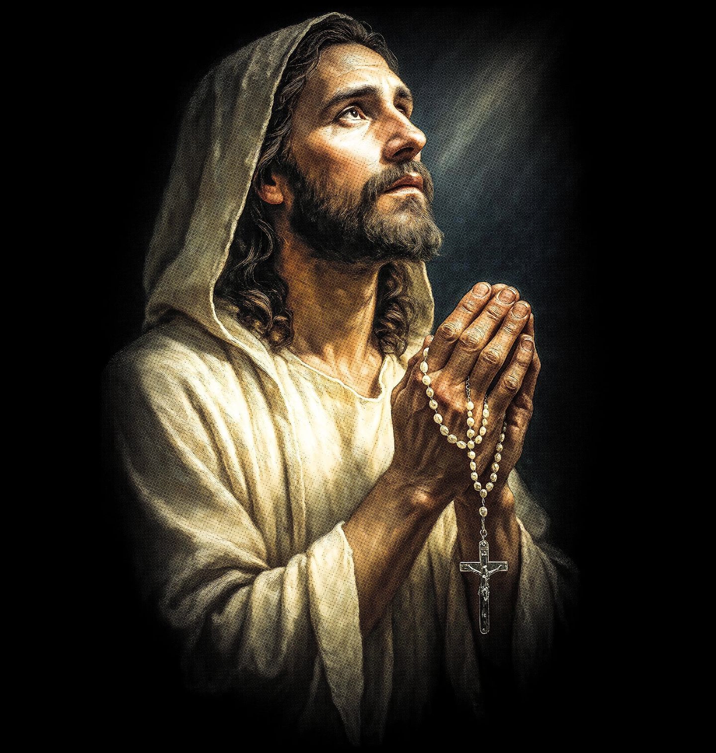 Dámské tričko Ježíš Kristus při Modlitbě. Motiv vychází z tradiční ikonografie křesťanství, kde je Ježíš zobrazován nejen jako Spasitel světa, ale také jako ten, kdo se sám obrací k Otci v modlitbě. Růženec v rukou zdůrazňuje význam rozjímání, odevzdání a ticha. Tento design je ideální pro všechny, kteří chtějí vyjádřit svou víru.