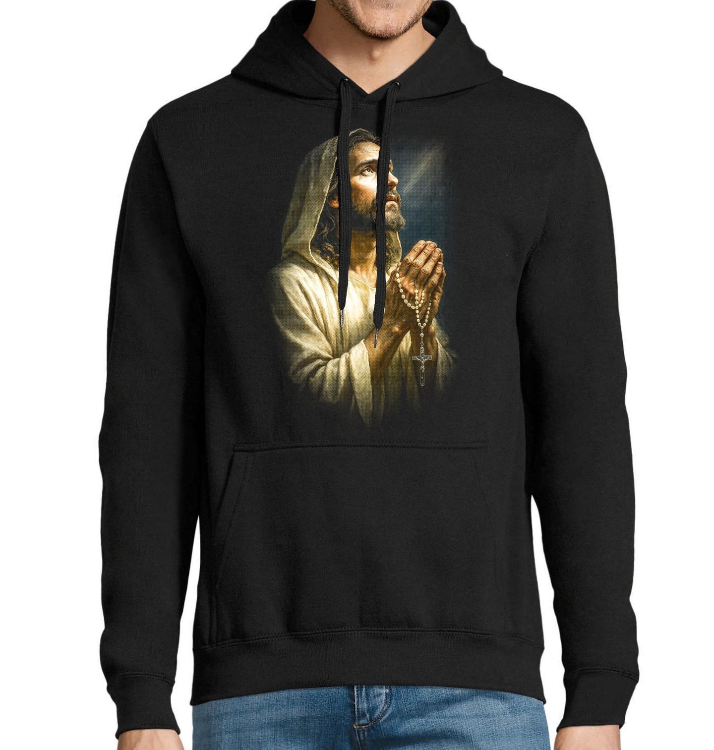Pánská mikina Ježíš Kristus při Modlitbě. Motiv vychází z tradiční ikonografie křesťanství, kde je Ježíš zobrazován nejen jako Spasitel světa, ale také jako ten, kdo se sám obrací k Otci v modlitbě. Růženec v rukou zdůrazňuje význam rozjímání, odevzdání a ticha. Tento design je ideální pro všechny, kteří chtějí vyjádřit svou víru.