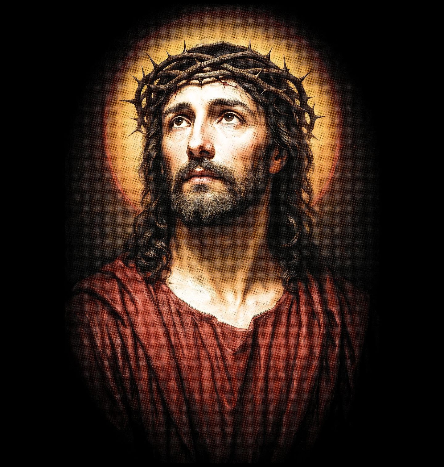 Dámské tričko Ježíš Kristus s Trnovou Korunou. Silný duchovní motiv zobrazující ježíš kristus s trnovou korunou a svatozáří, pohledem obráceným k nebi. Výraz tváře vyjadřuje pokoru, oběť, bolest i nekonečné milosrdenství. Motiv je hluboce zakořeněn v tradici křesťanství, kde je Ježíš chápán jako Spasitel, Vykupitel a Syn Boží. Trnová koruna zde symbolizuje utrpení, lásku k lidstvu a cestu k vykoupení.