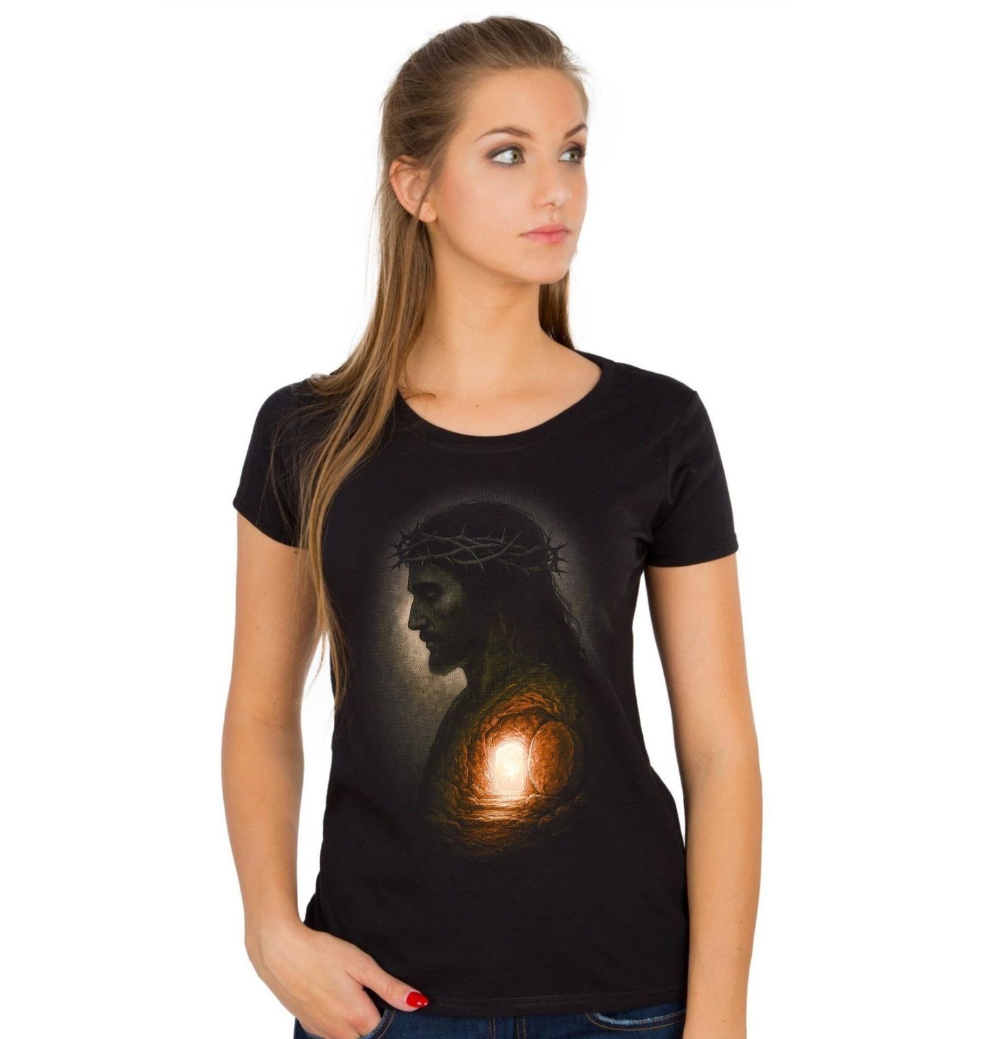 Dámské tričko Ježíš Kristus Světlo na Konci Tunelu. Tento hluboce emotivní motiv zobrazuje postavu ježíš kristus v tichém profilu, s trnovou korunou a temnotou kolem, kterou proráží světlo vycházející z jeho nitra. Obraz pracuje s kontrastem temnoty a světla jako základním poselstvím křesťanství – oběť, smrt a znovuzrození nejsou koncem, ale branou k vykoupení.