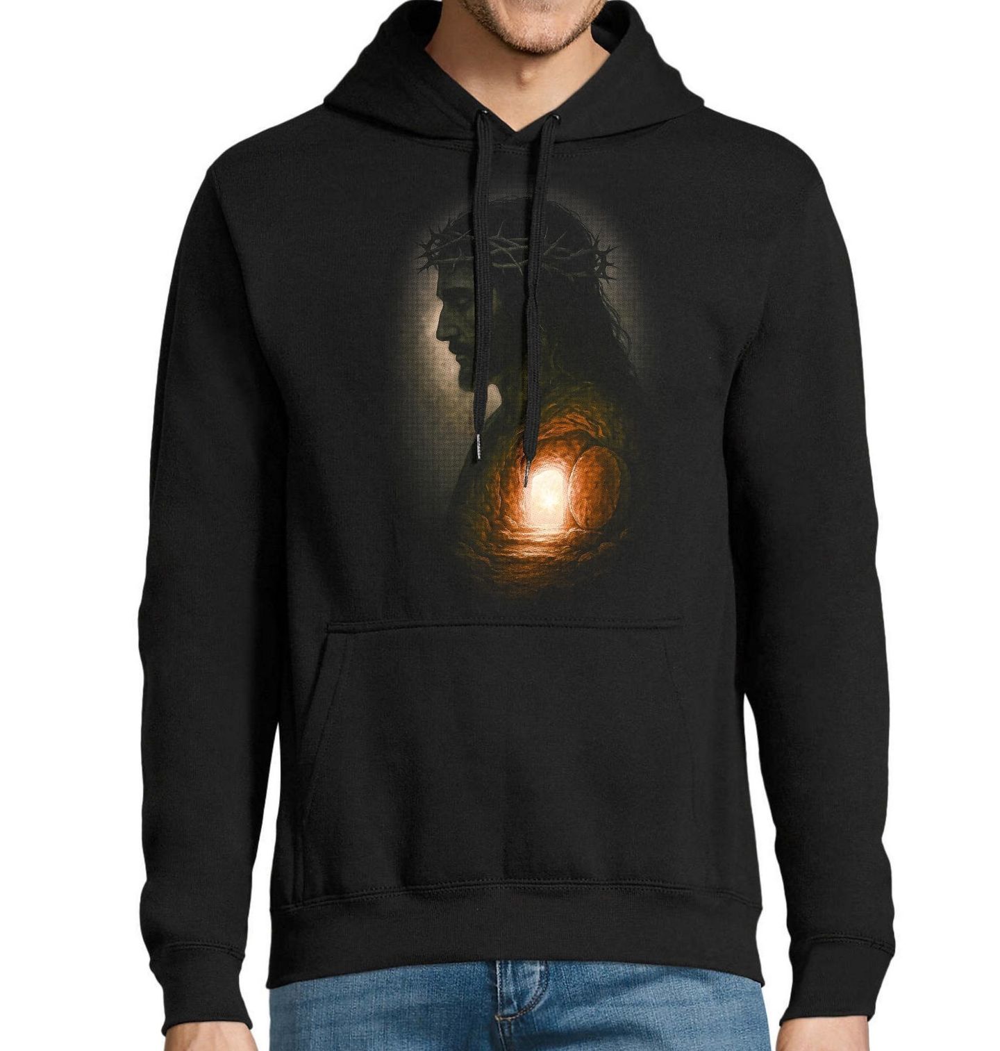 Pánská mikina Ježíš Kristus Světlo na Konci Tunelu. Tento hluboce emotivní motiv zobrazuje postavu ježíš kristus v tichém profilu, s trnovou korunou a temnotou kolem, kterou proráží světlo vycházející z jeho nitra. Obraz pracuje s kontrastem temnoty a světla jako základním poselstvím křesťanství – oběť, smrt a znovuzrození nejsou koncem, ale branou k vykoupení.