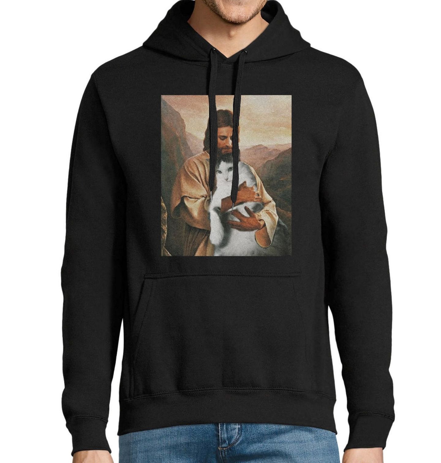 Pánská mikina Ježíš miluje Kočky. Tento originální motiv zobrazuje něžnou scénu inspirovanou náboženským uměním, kde Ježíš drží v náručí klidnou kočku. Jde o jemnou a vkusnou parodie, která propojuje motivy křesťanství s láskou ke zvířatům a domácí pohodou. Design působí uklidňujícím dojmem a zároveň přináší lehký humor. Kočka na obrázku připomíná běžnou domácí krátkosrstou kočku.