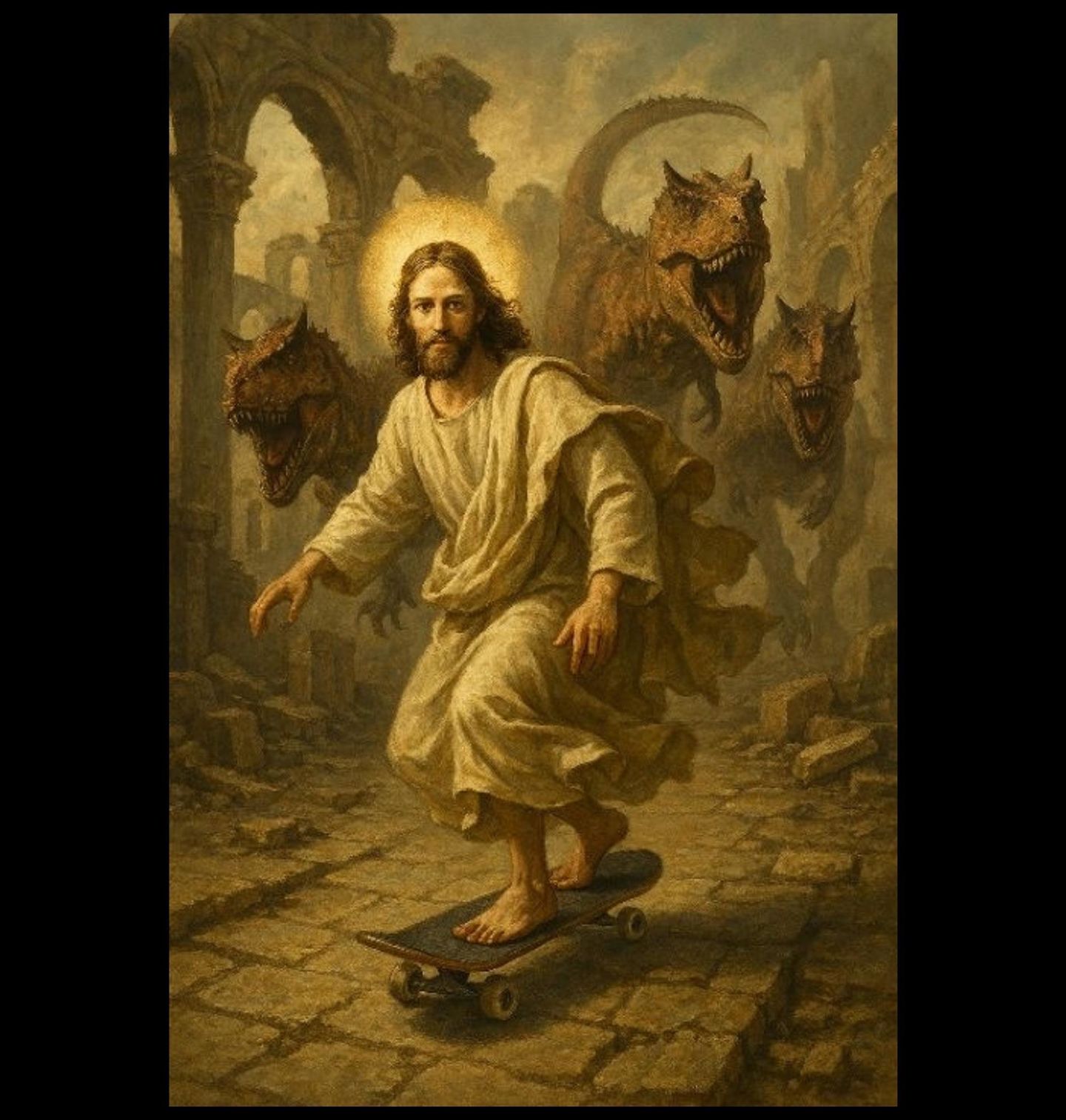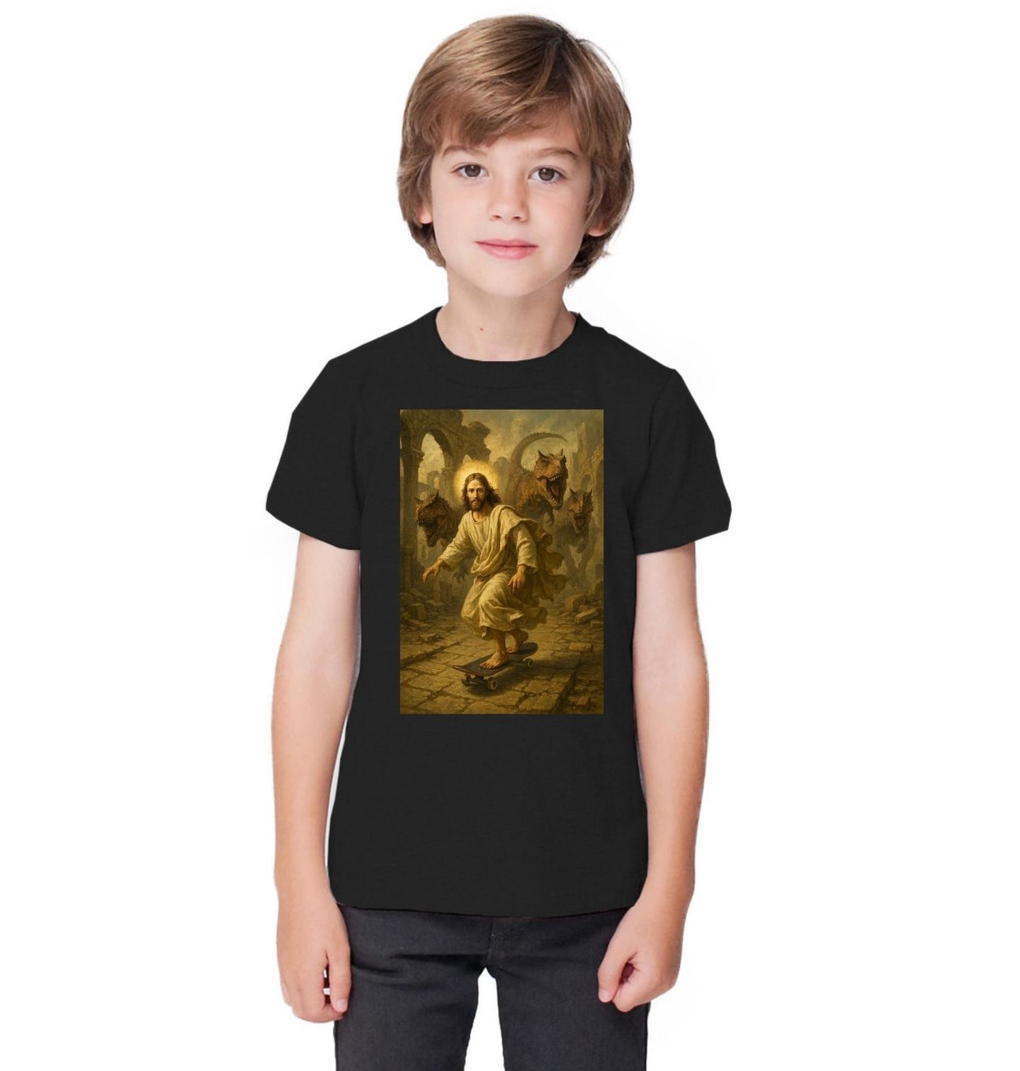 Dětské tričko Ježíš na Skateboardu Útěk před Dinosaury. Nečekané spojení historie, víry a humoru přináší tento motiv, kde Ježíš ujíždí na skateboardu před nebezpečnými T-Rexy. Celý design je zpracovaný jako stylizovaná parodie klasického náboženského obrazu, ale s moderním a vtipným twistem. Motiv kombinuje ikonickou postavu Ježíše s akční scénou plnou napětí a nadsázky. Skateboard dodává dynamiku a moderní vibe, zatímco dinosaurus přináší absurdní a zábavný kontrast k tradičnímu stylu malby.