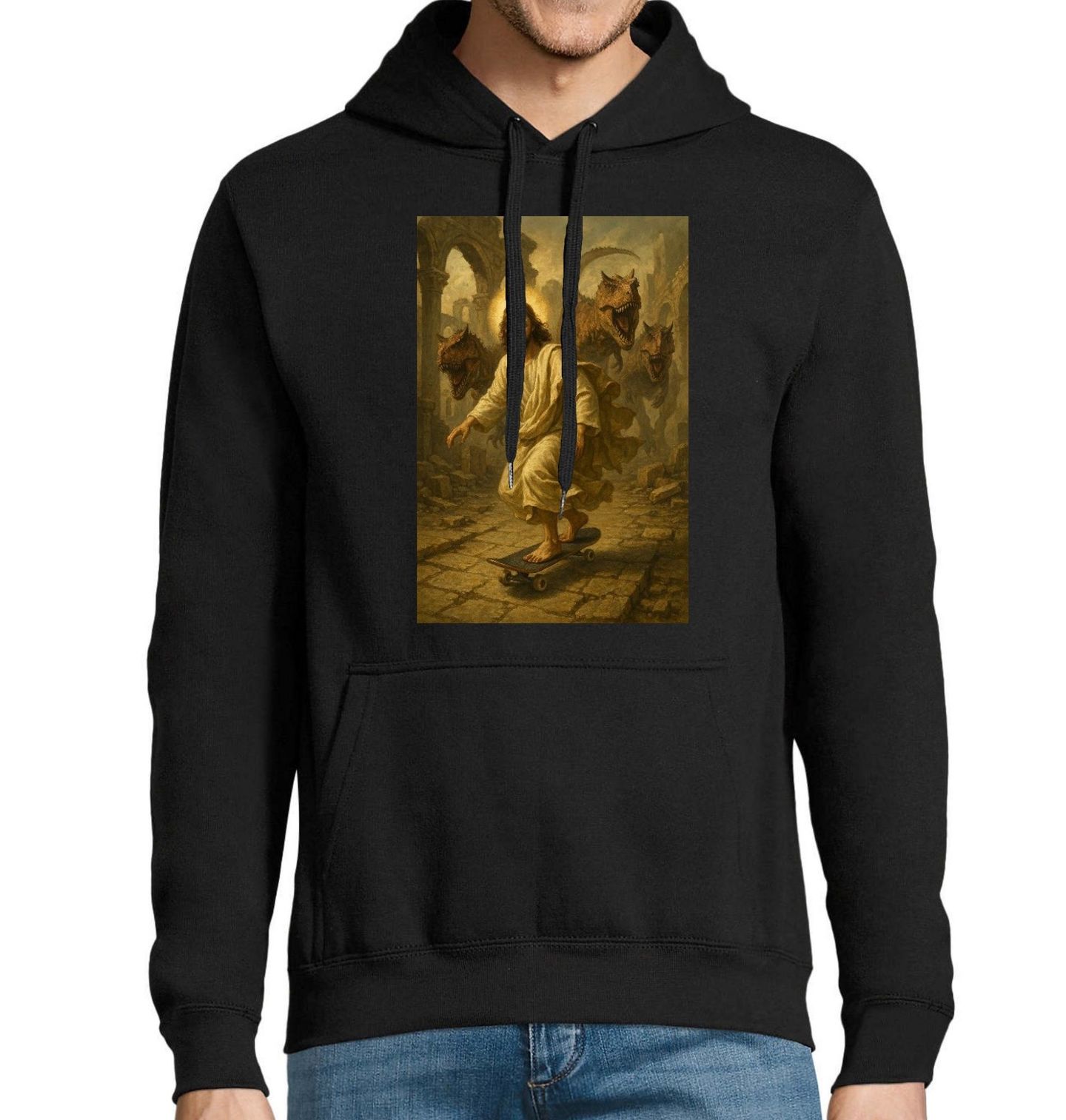 Pánská mikina Ježíš na Skateboardu Útěk před Dinosaury. Nečekané spojení historie, víry a humoru přináší tento motiv, kde Ježíš ujíždí na skateboardu před nebezpečnými T-Rexy. Celý design je zpracovaný jako stylizovaná parodie klasického náboženského obrazu, ale s moderním a vtipným twistem. Motiv kombinuje ikonickou postavu Ježíše s akční scénou plnou napětí a nadsázky. Skateboard dodává dynamiku a moderní vibe, zatímco dinosaurus přináší absurdní a zábavný kontrast k tradičnímu stylu malby.