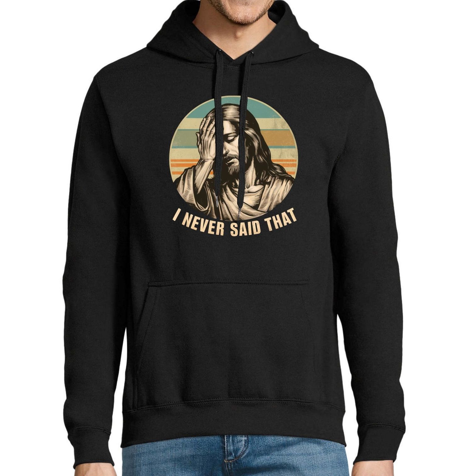 Pánská mikina Ježíš Nikdy jsem to neřekl I Never Said That. Klasická facepalm ilustrace s ikonickou postavou Ježíše a vtipným nápisem „I Never Said That“. Tento motiv je ideální pro ty, kdo mají smysl pro humor a nadhled nad tím, jak se některé myšlenky a výroky překrucují. Skvělá volba pro každého, kdo ocení satiru a chce vyjádřit svůj postoj s lehkostí a ironií.