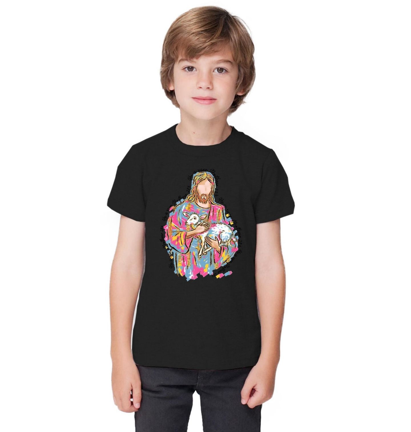 Dětské tričko Ježíš s Beránkem. Tento originální motiv zobrazuje postavu, kterou zná celý svět – Ježíš jemně držící v náručí beránek. Barevné umělecké zpracování dává tradičnímu motivu nový rozměr a propojuje klasické křesťanství s moderním stylem. Design je vhodný pro každého, kdo chce vyjádřit význam náboženství v každodenním životě.