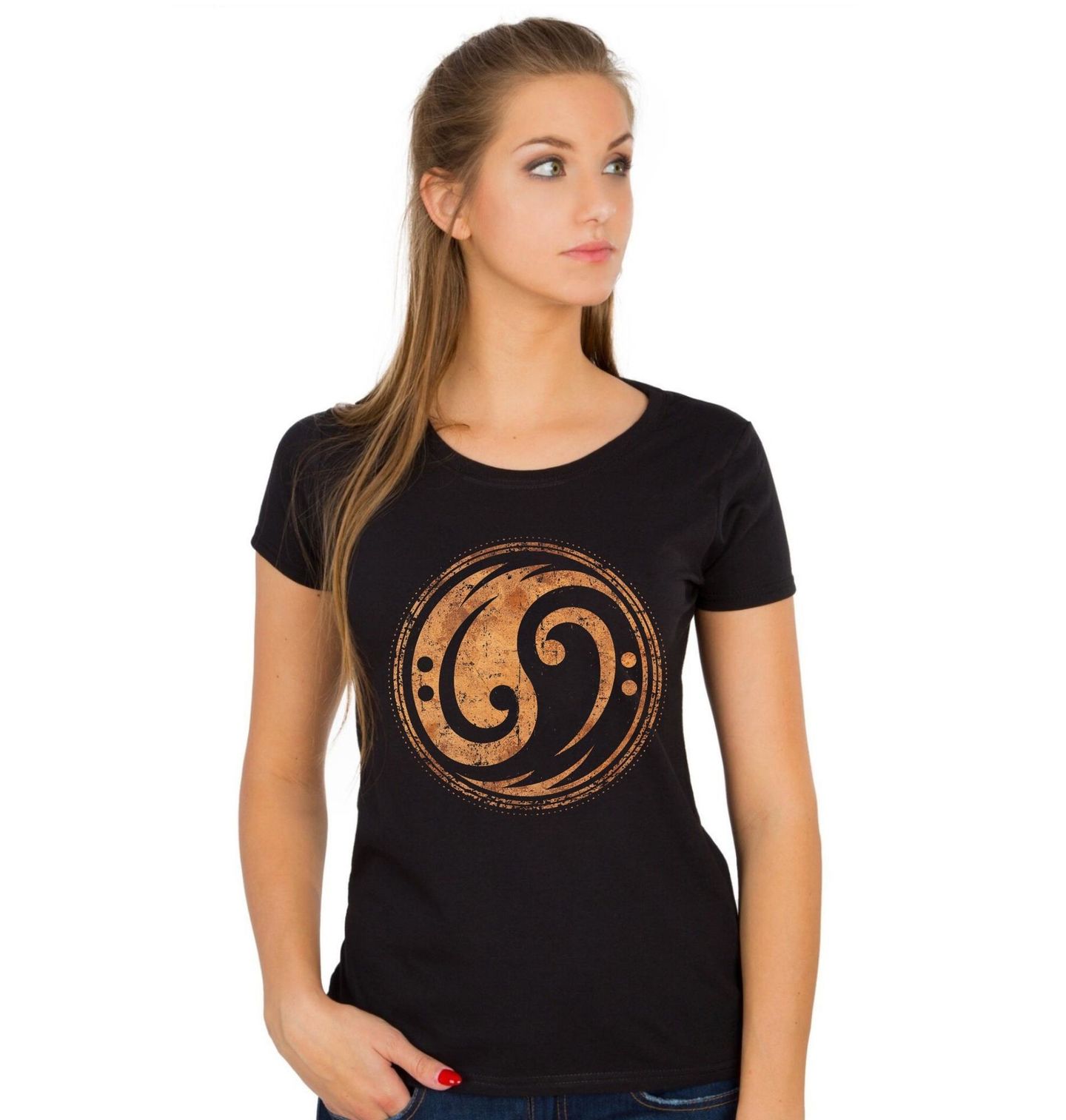 Dámské tričko Jin a Jang Basový Klíč. Originální motiv spojuje hudbu a filozofii do jednoho silného symbolu. Design zobrazuje Basový Klíč stylizovaný do podoby symbolu jin a jang, který představuje rovnováhu protikladů – světlo a tmu, rytmus a ticho, energii a klid. Dominantní grafika s vintage patinou působí výrazně, minimalisticky a přesto hluboce symbolicky.
