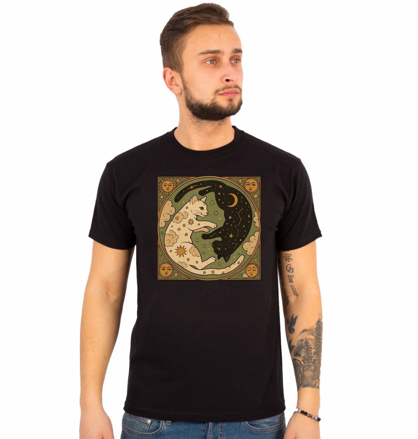 Pánské tričko Jin a Jang Černá a Bílá Kočka. Ilustrace zobrazuje dvě protikladné bytosti, které tvoří harmonický celek – světlá a temná kočka se vzájemně doplňují v kruhové kompozici inspirované symbolem jin a jang. Celý motiv je doplněn prvky, jako jsou hvězdy, měsíc a slunce, které podtrhují kosmickou atmosféru.