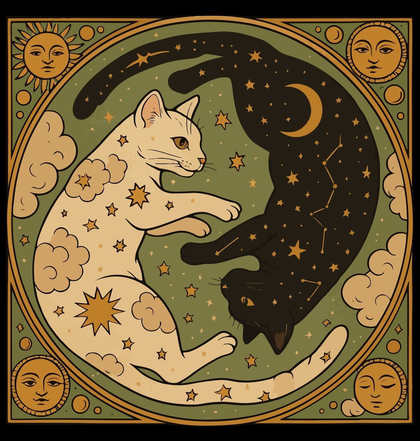 Dětské tričko Jin a Jang Černá a Bílá Kočka. Ilustrace zobrazuje dvě protikladné bytosti, které tvoří harmonický celek – světlá a temná kočka se vzájemně doplňují v kruhové kompozici inspirované symbolem jin a jang. Celý motiv je doplněn prvky, jako jsou hvězdy, měsíc a slunce, které podtrhují kosmickou atmosféru.