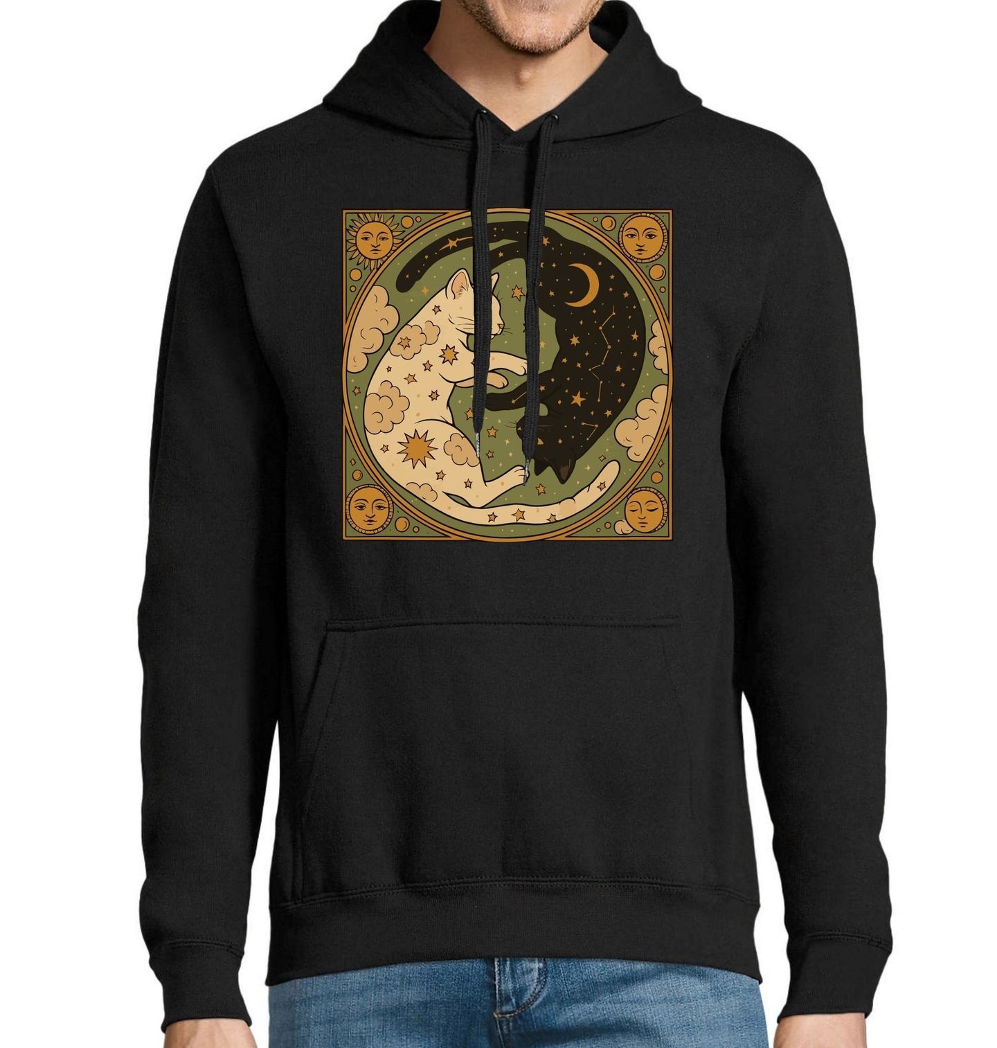 Pánská mikina Jin a Jang Černá a Bílá Kočka. Ilustrace zobrazuje dvě protikladné bytosti, které tvoří harmonický celek – světlá a temná kočka se vzájemně doplňují v kruhové kompozici inspirované symbolem jin a jang. Celý motiv je doplněn prvky, jako jsou hvězdy, měsíc a slunce, které podtrhují kosmickou atmosféru.