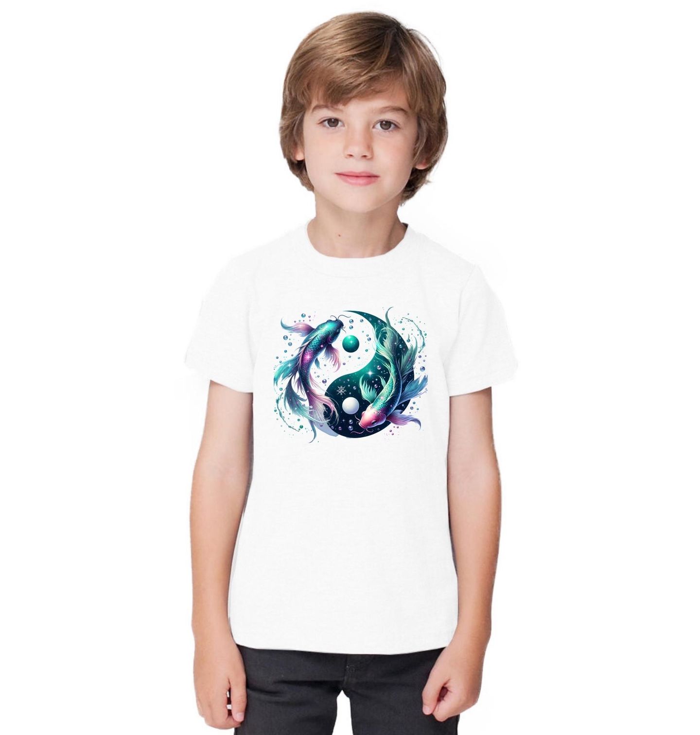 Dětské tričko Jin a Jang Kapr Koi Horoskop Ryby. Ponořte se do hlubin vnitřní rovnováhy s motivem Jin Jang a znamení Ryby. Tento design propojuje mystický symbol Jin Jang s jemnou energií horoskopu – znamení zvěrokruhu Ryby. Dvě elegantní ryby v harmonickém kruhu symbolizují duální povahu života, citlivost, intuici a spirituální rovnováhu.