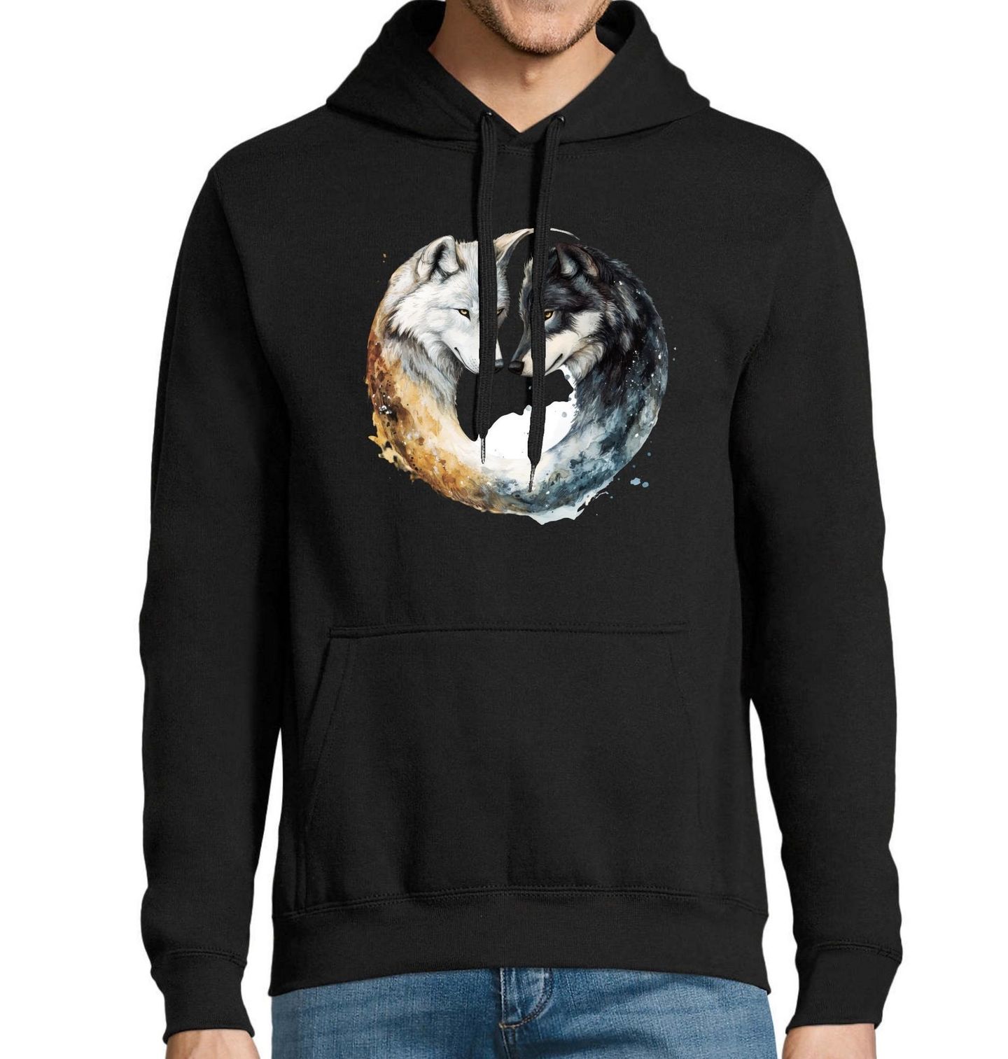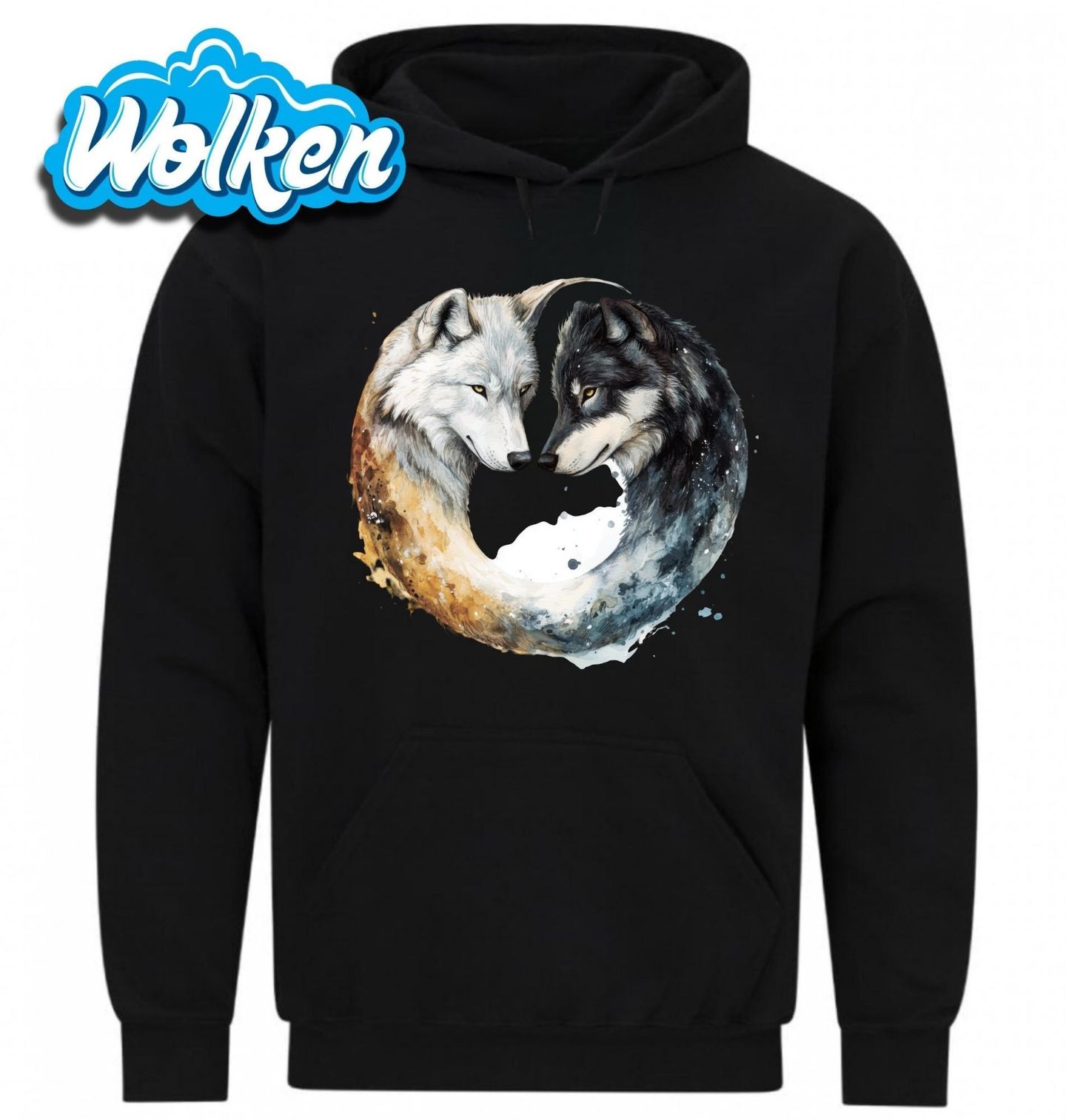 Pánská mikina Jin a Jang Vlci Bílý a Černý Vlk. Originální design zobrazuje dva vlky – bílého a černého – jak se navzájem dívají, tvořící harmonickou kompozici připomínající symbol jin jang. Tento motiv symbolizuje rovnováhu, sílu a moudrost divoké přírody, ideální pro milovníky přírody a výrazných, mystických vzorů.