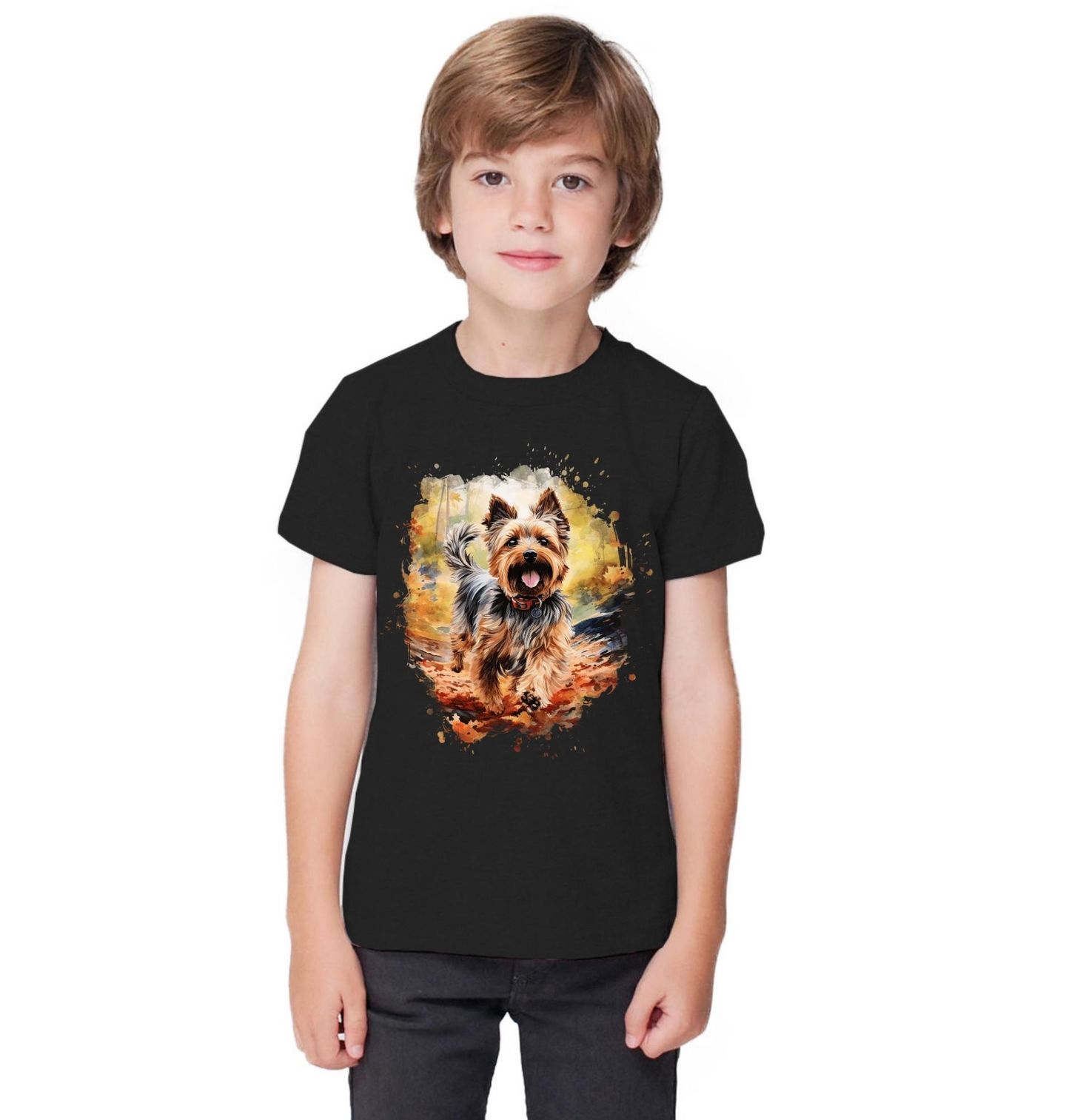 Dětské tričko Jorkšírský teriér na Procházce. Jorkšírský teriér letí lesní stezkou, jazyk venku, uši ve větru a hlava plná radosti. Přesně ten moment, který každý pejskař zná až moc dobře. Kolem les, pod tlapkami listí a svět je najednou úplně v pohodě. Motiv srší energií, dobrou náladou a lehkým chaosem, který dělá společné procházky tak zábavné.