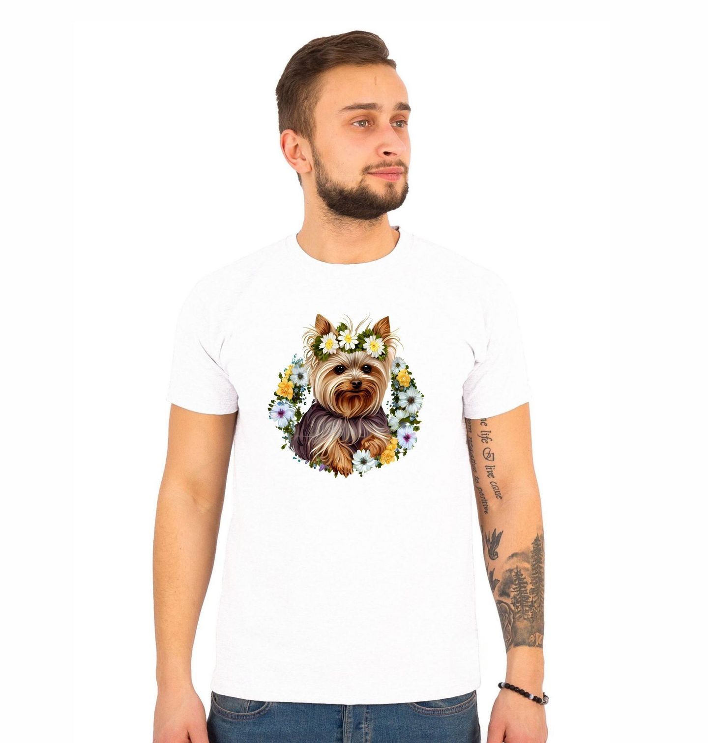Pánské tričko Jorkšírský teriér v Květinovém Věnci. Roztomilý pes plemene Jorkšírský teriér, obklopený bohatým věncem z jemných květin. Typická dlouhá srst, bystrý pohled a přátelský výraz dělají z tohoto motivu ideální volbu pro každého pejskaře, kdo má k tomuto plemeni blízký vztah.